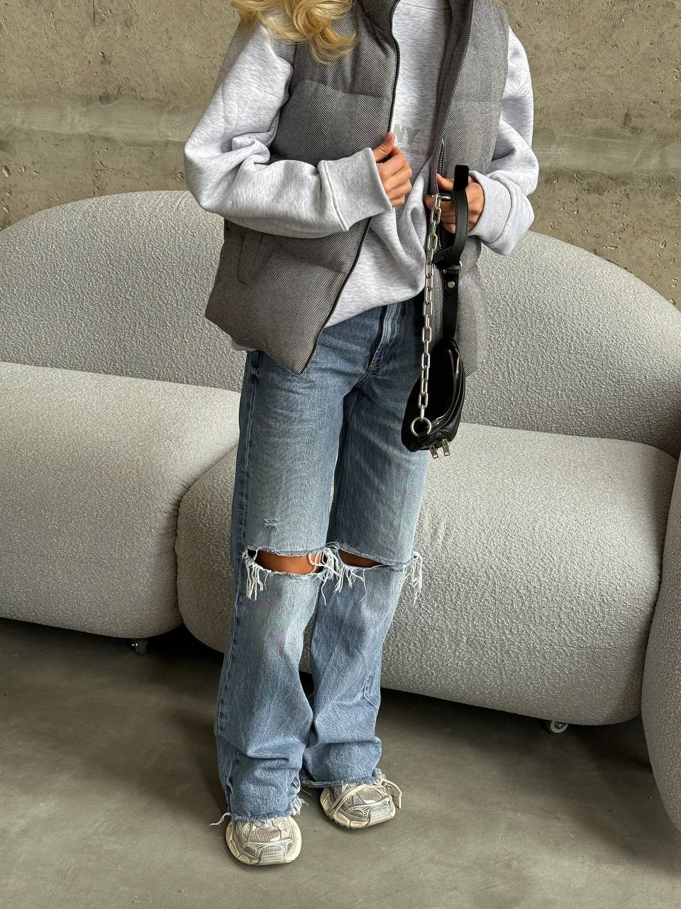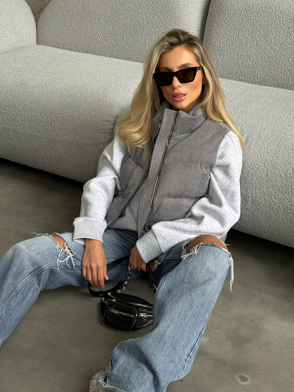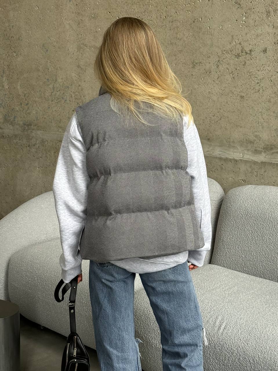 Szary bezrękawnik w jodełkę (60% poliester, 40% wełna)