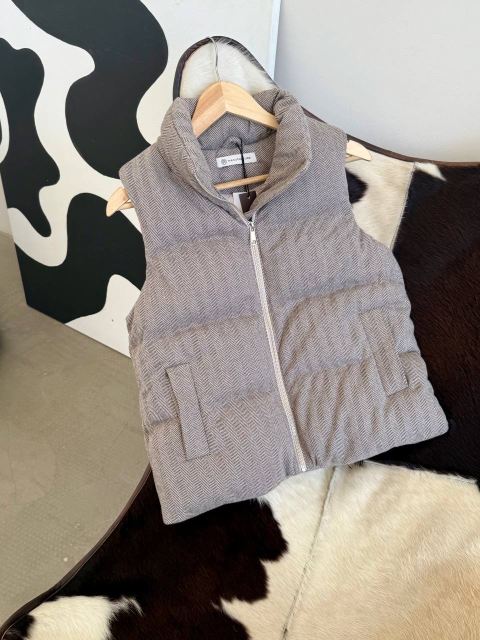 Szary bezrękawnik w jodełkę (60% poliester, 40% wełna)