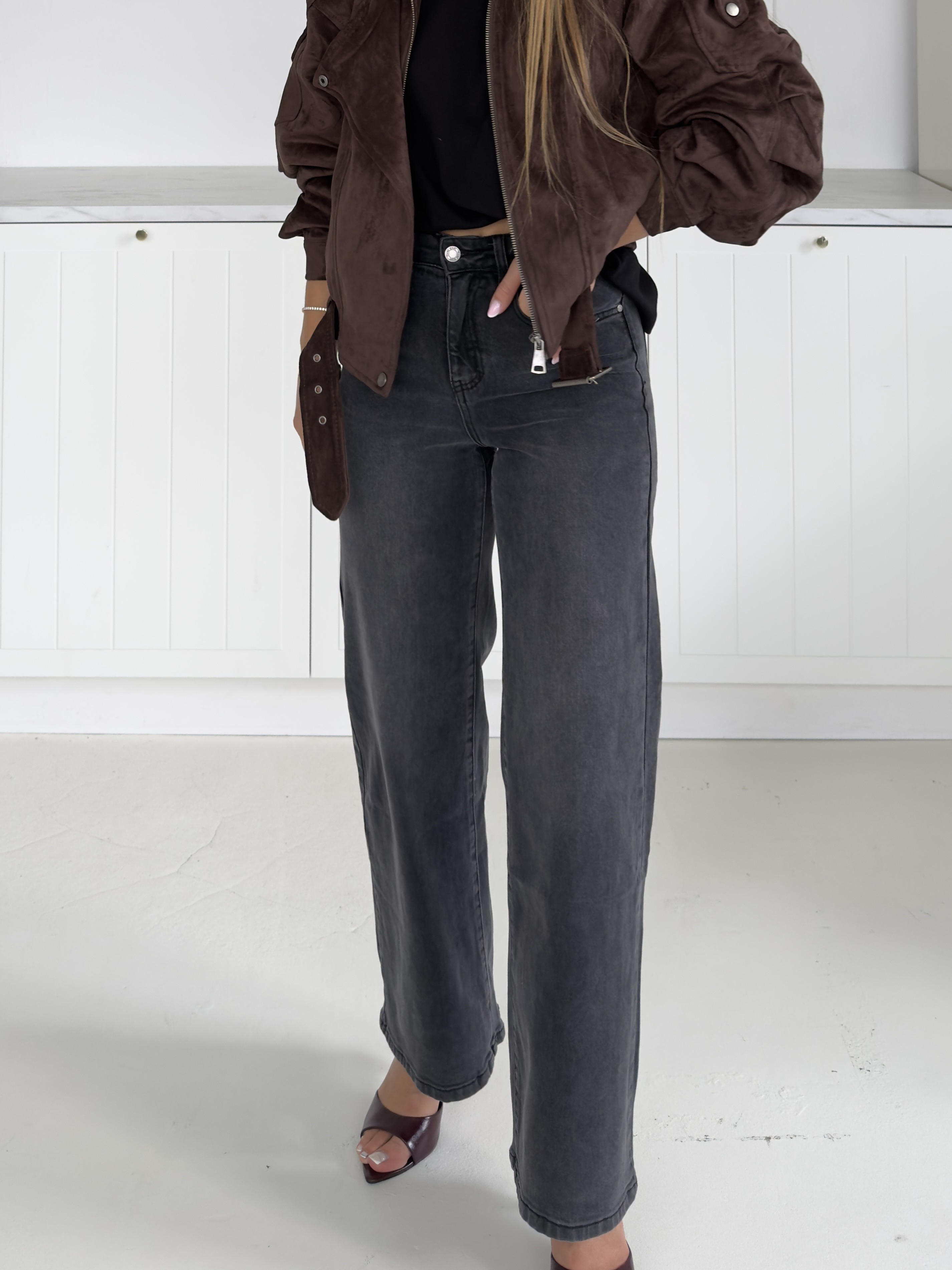 Jeansy Loreen w odcieniu spranej czerni to must-have w szafie. Posiadają wysoki stan i szerokie nogawki, które optycznie wydłużają sylwetkę. Klasyczny fason w nowoczesnym wydaniu sprawdzi się zarówno w casualowych, jak i bardziej eleganckich stylizacjach
