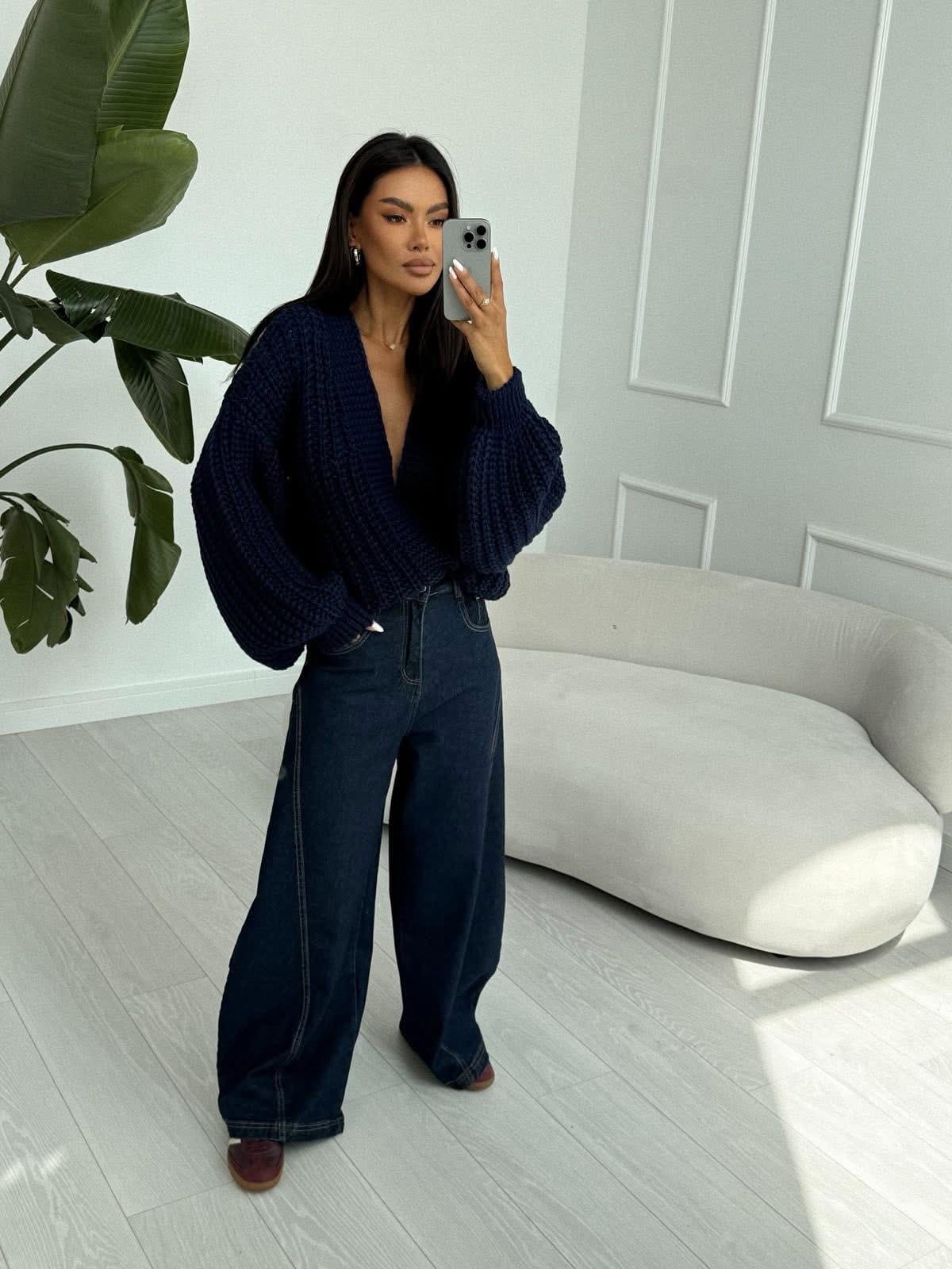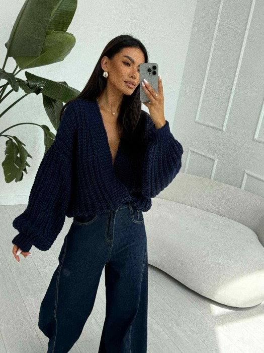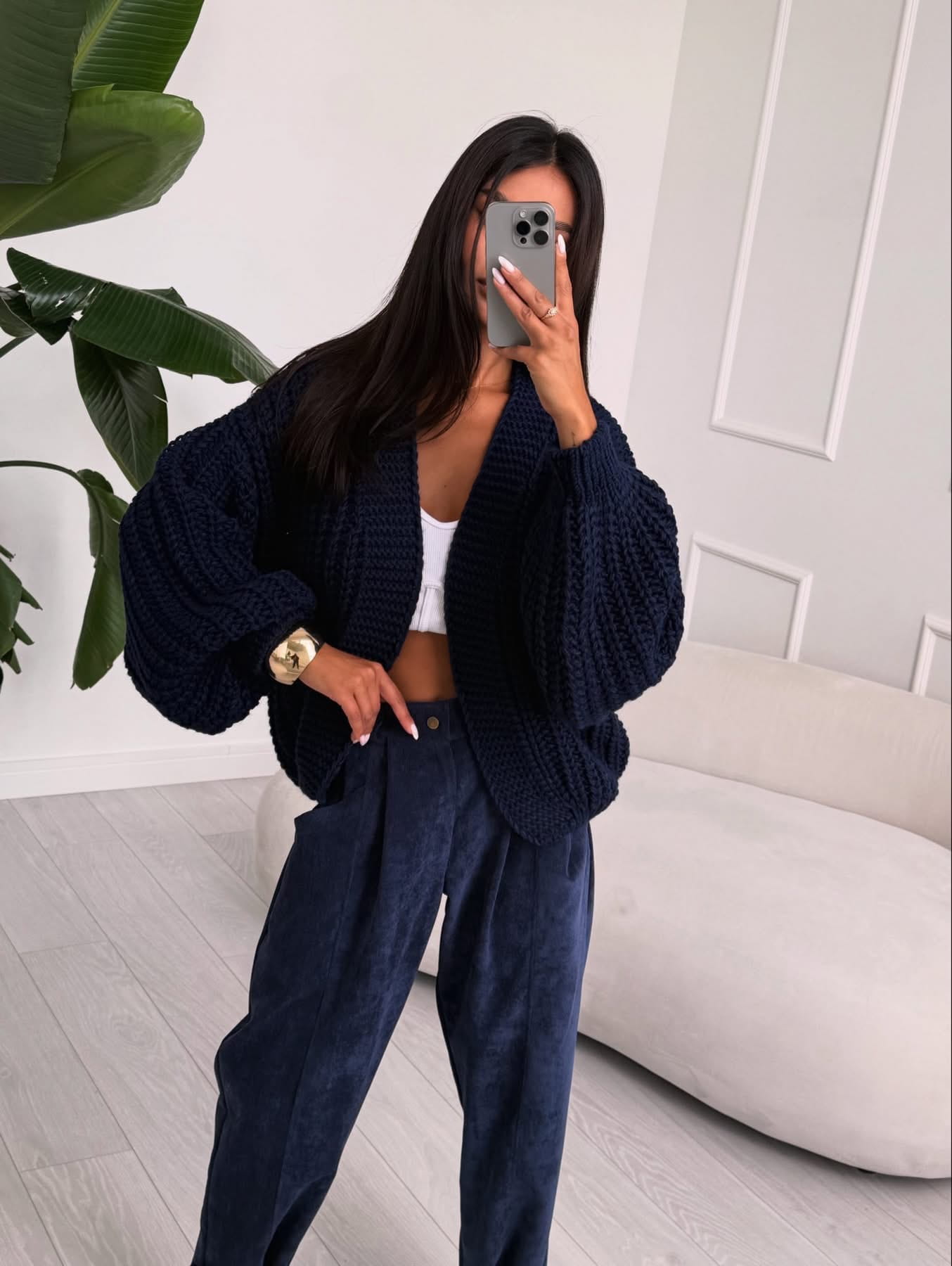 Ten kardigan to wyrafinowany model o luźnym kroju, wykonany z grubego, mięsistego splotu w głębokim, granatowym odcieniu. Jego obszerne rękawy i lekko oversize’owa forma nadają mu nowoczesny, nonszalancki charakter, a zarazem subtelną elegancję. Idealny wybór na stylowy, ale komfortowy look.