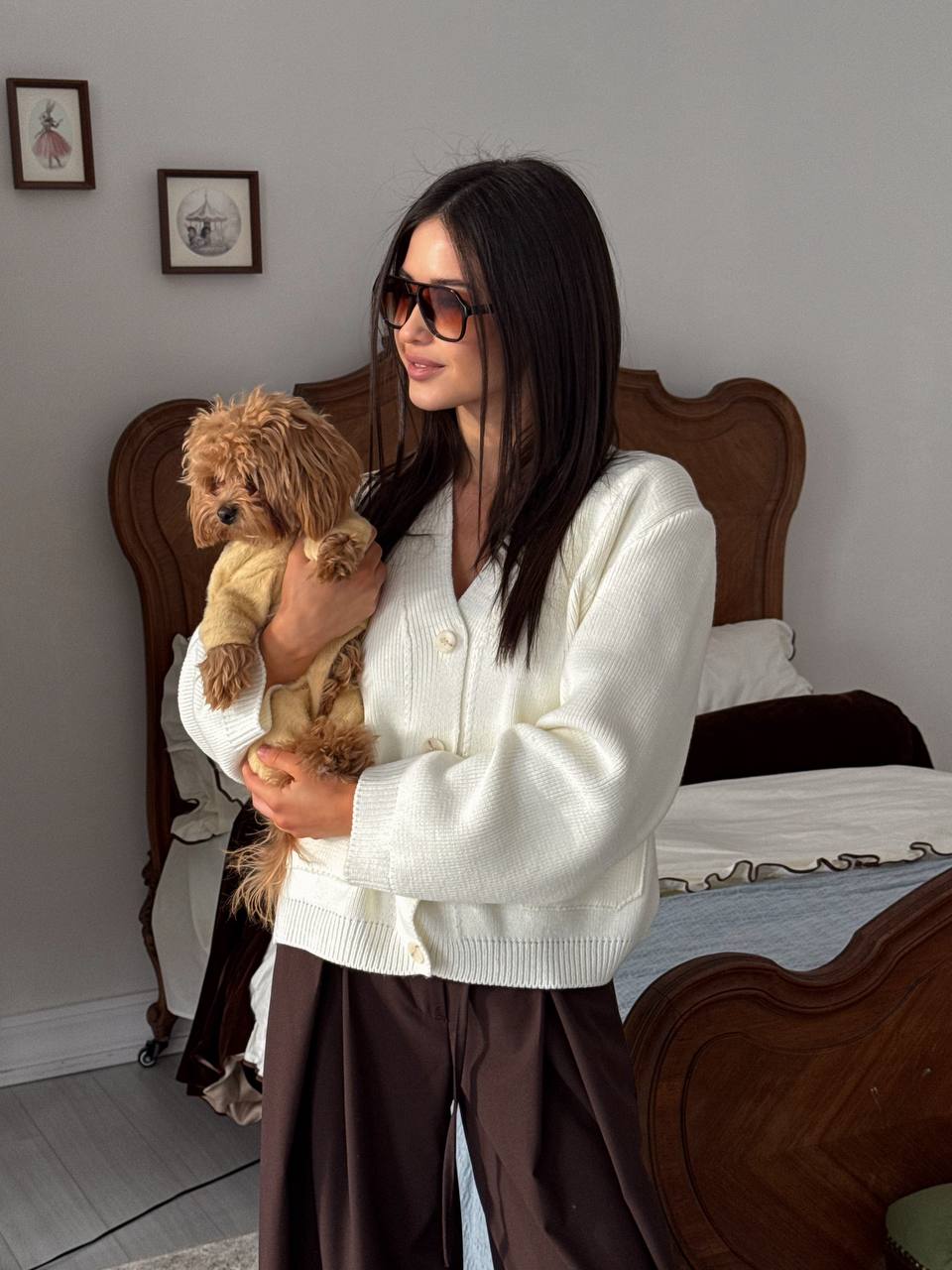 Posiada głęboki dekolt V zapinany na duże guziki w tym samym kolorze, dwie praktyczne kieszenie oraz lekko obniżone rękawy, które nadają mu swobodnego charakteru. Długość do bioder sprawia, że świetnie prezentuje się zarówno w casualowych, jak i bardziej eleganckich stylizacjach.