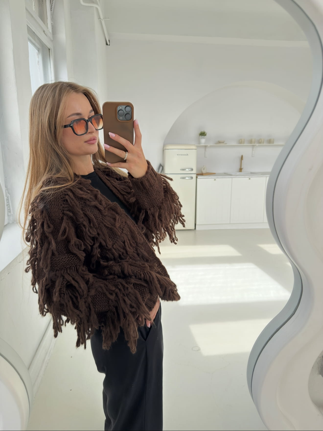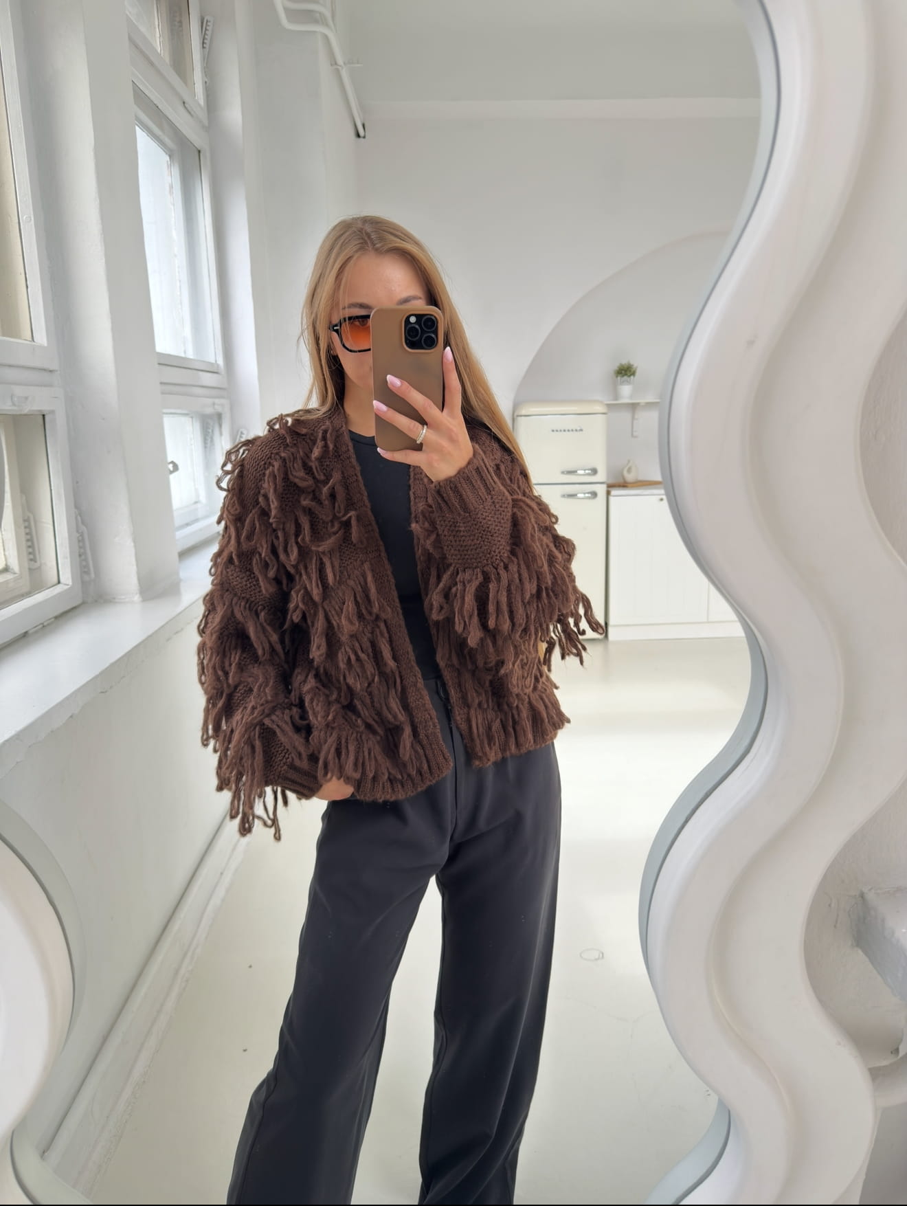 Brązowy kardigan Mona z frędzlami to połączenie wygody i oryginalnego stylu. Wykonany z miękkiej, przyjemnej w dotyku dzianiny, zapewnia ciepło i komfort noszenia. Luźny fason z efektownymi frędzlami nadaje mu charakteru i sprawia, że każda stylizacja staje się wyjątkowa. Idealny na chłodniejsze dni.