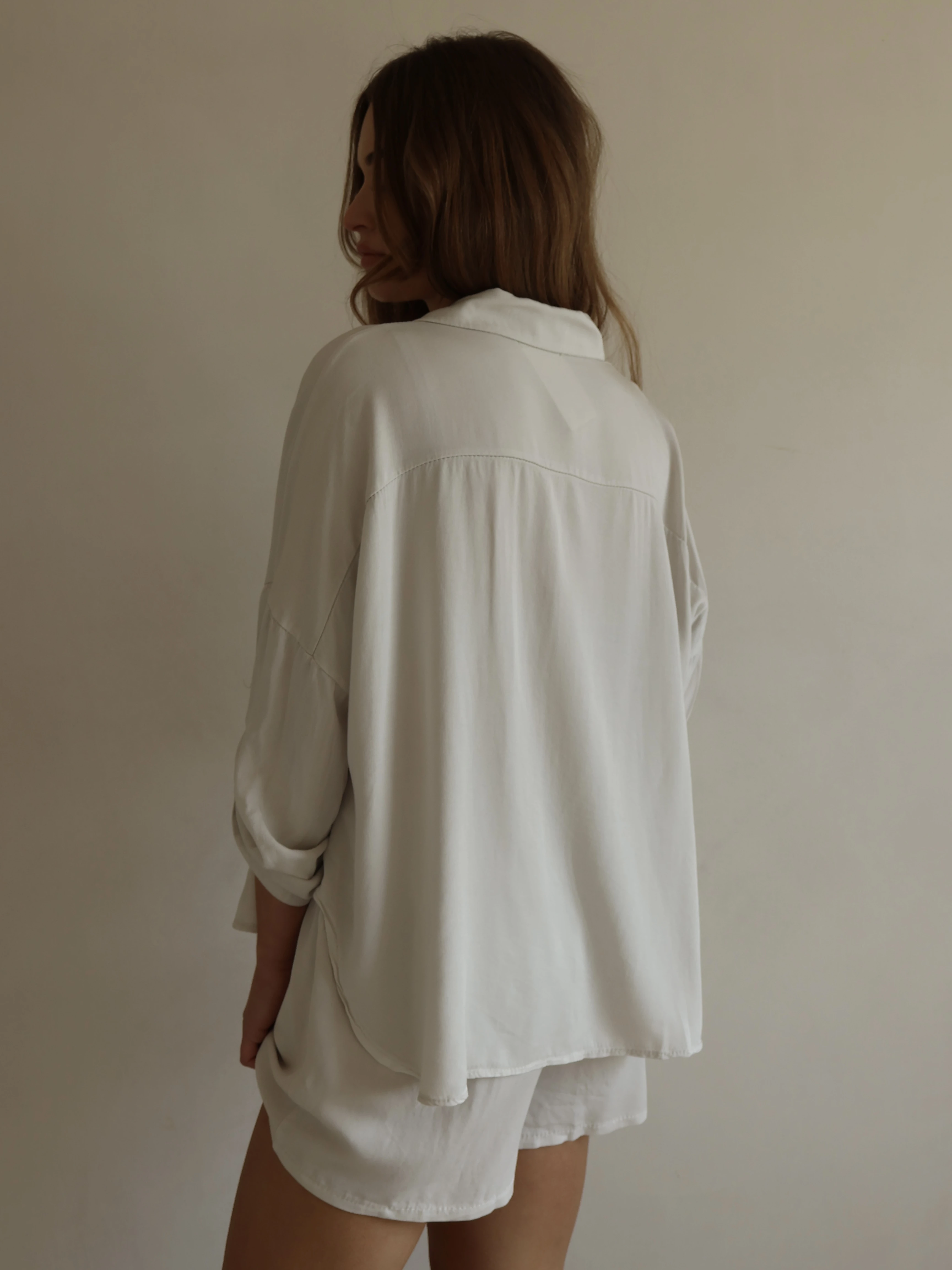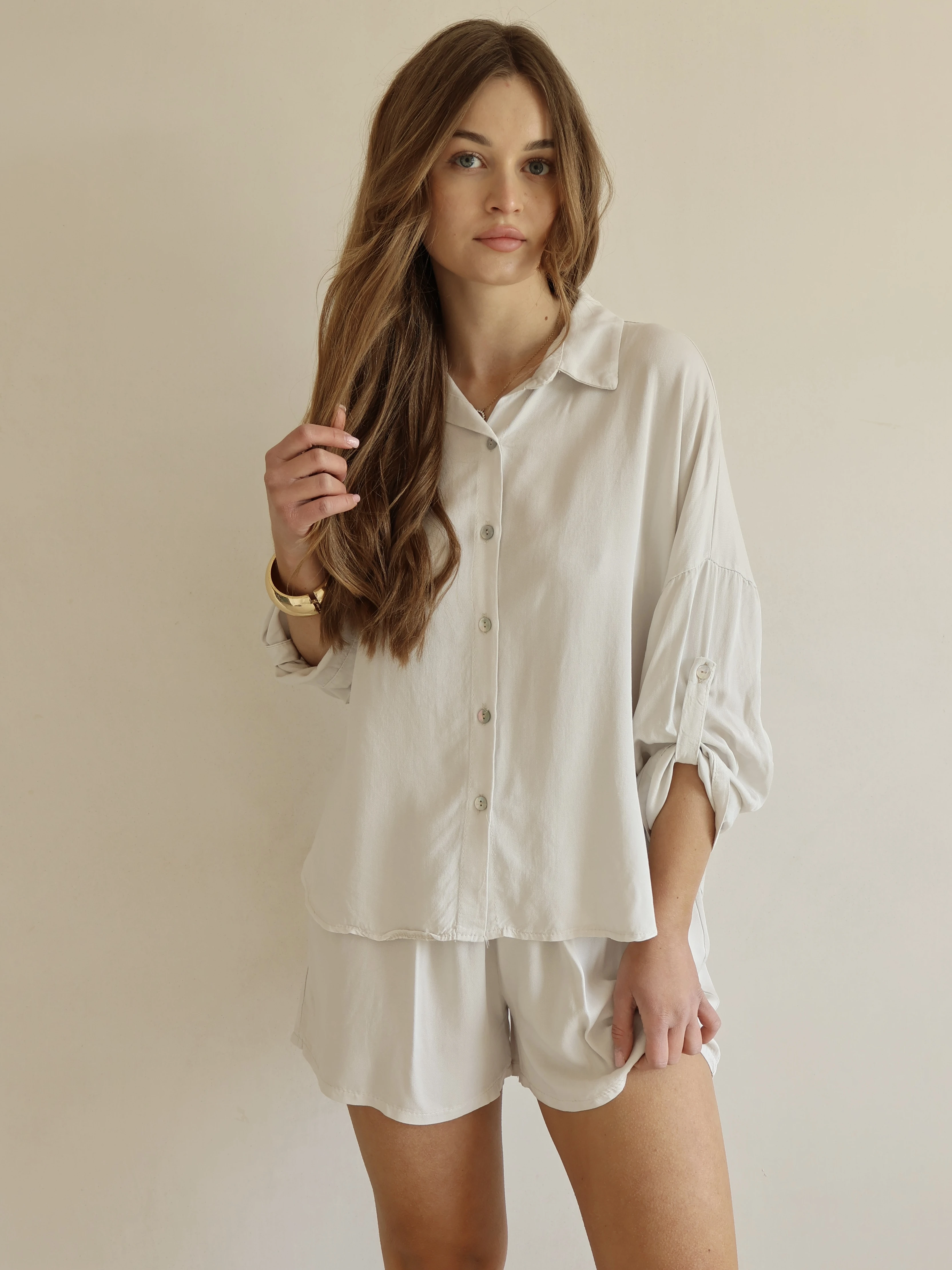 Luźna koszula i wygodne szorty tworzą stylizację, która sprawdzi się na co dzień i w podróży.