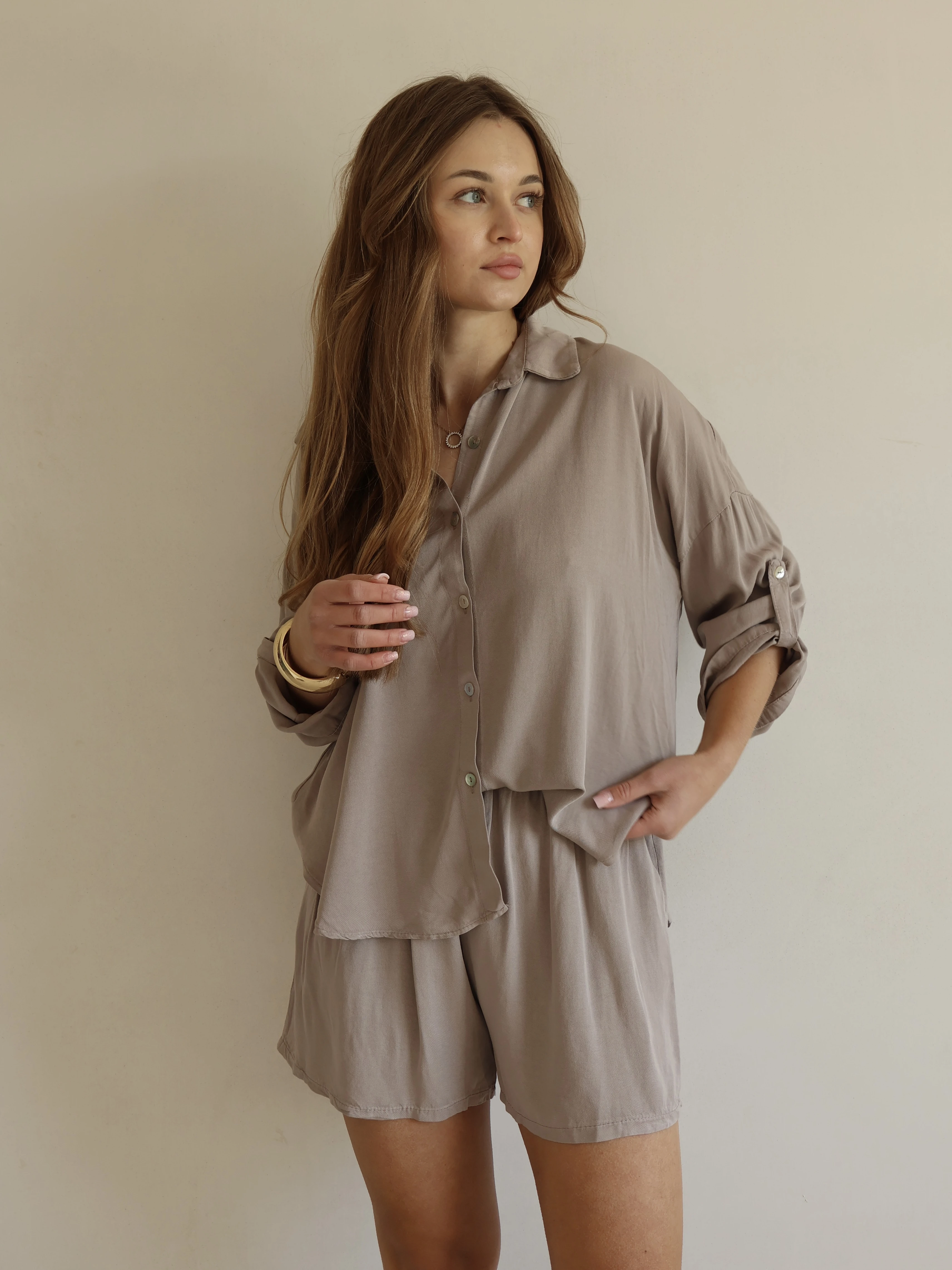 Luźna koszula i wygodne szorty tworzą stylizację, która sprawdzi się na co dzień i w podróży.