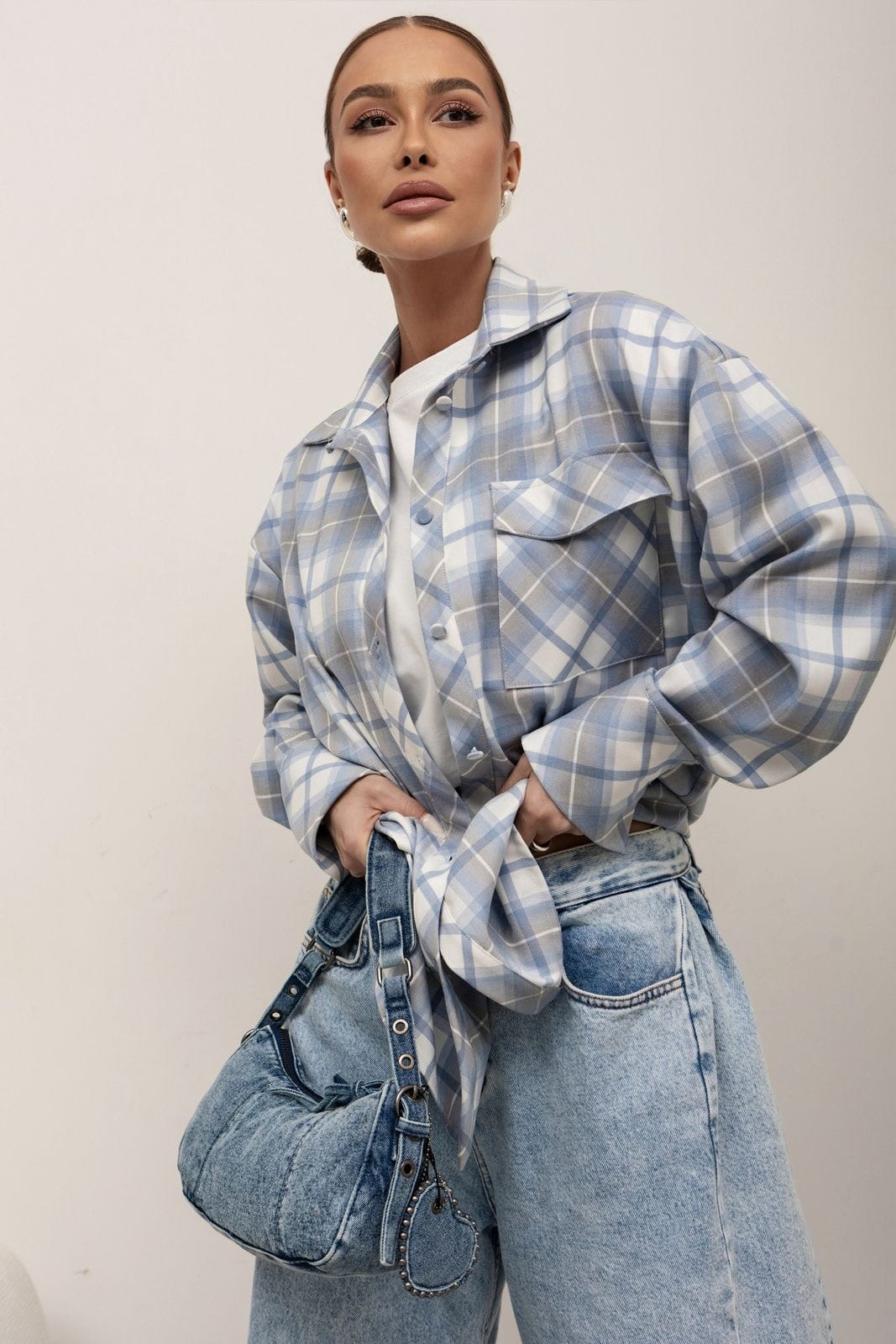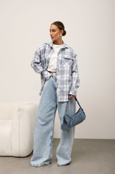 Koszula w kratę z wiskozy Lora niebiesko-szara