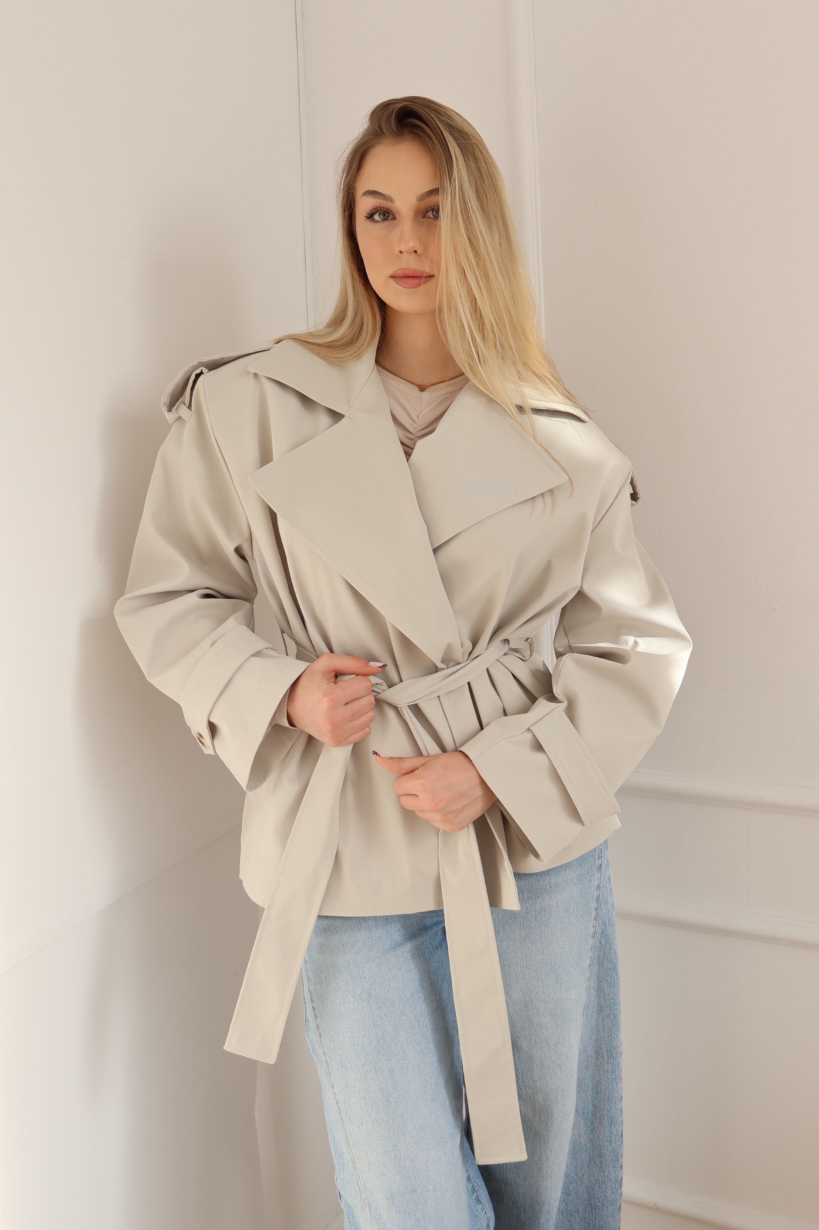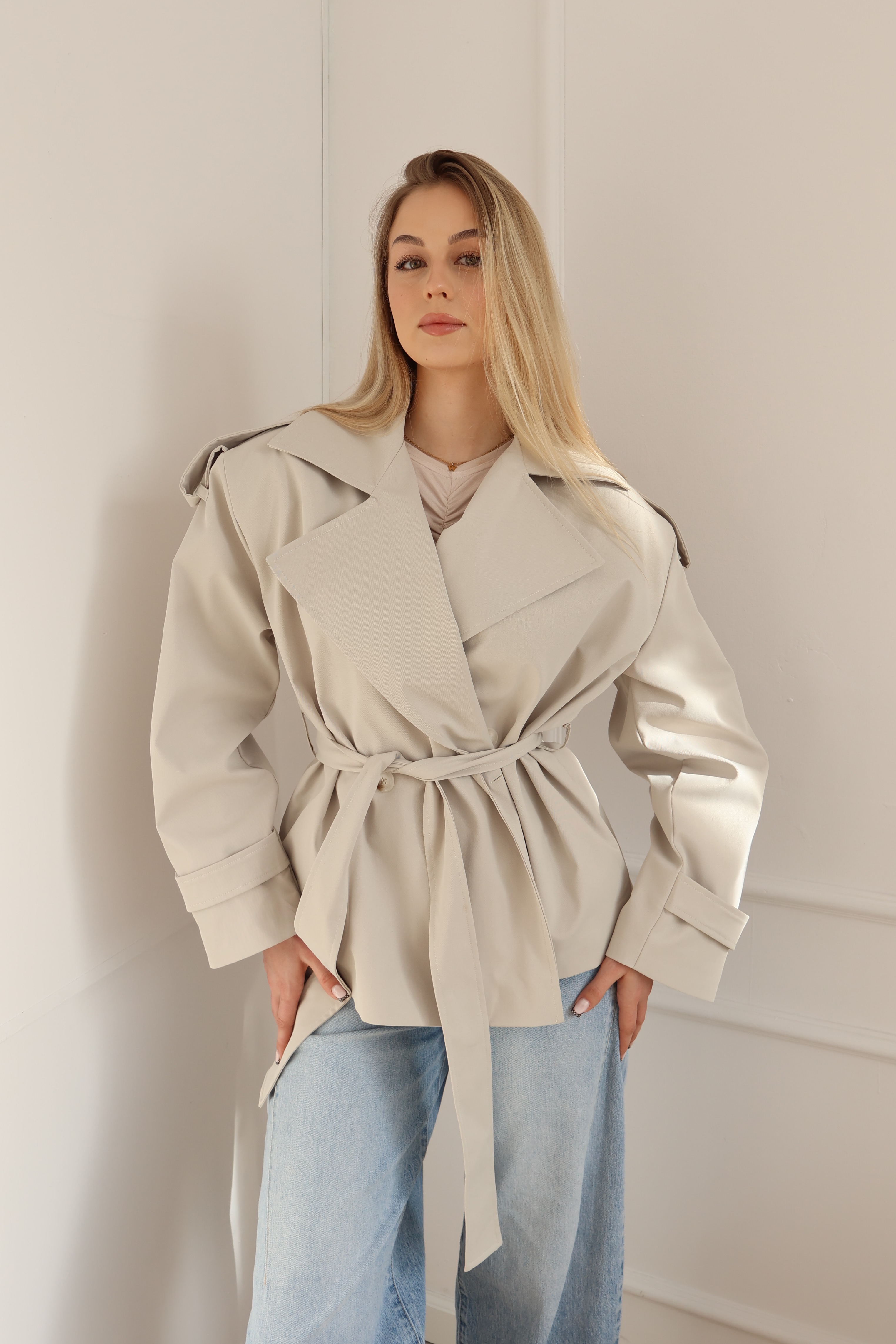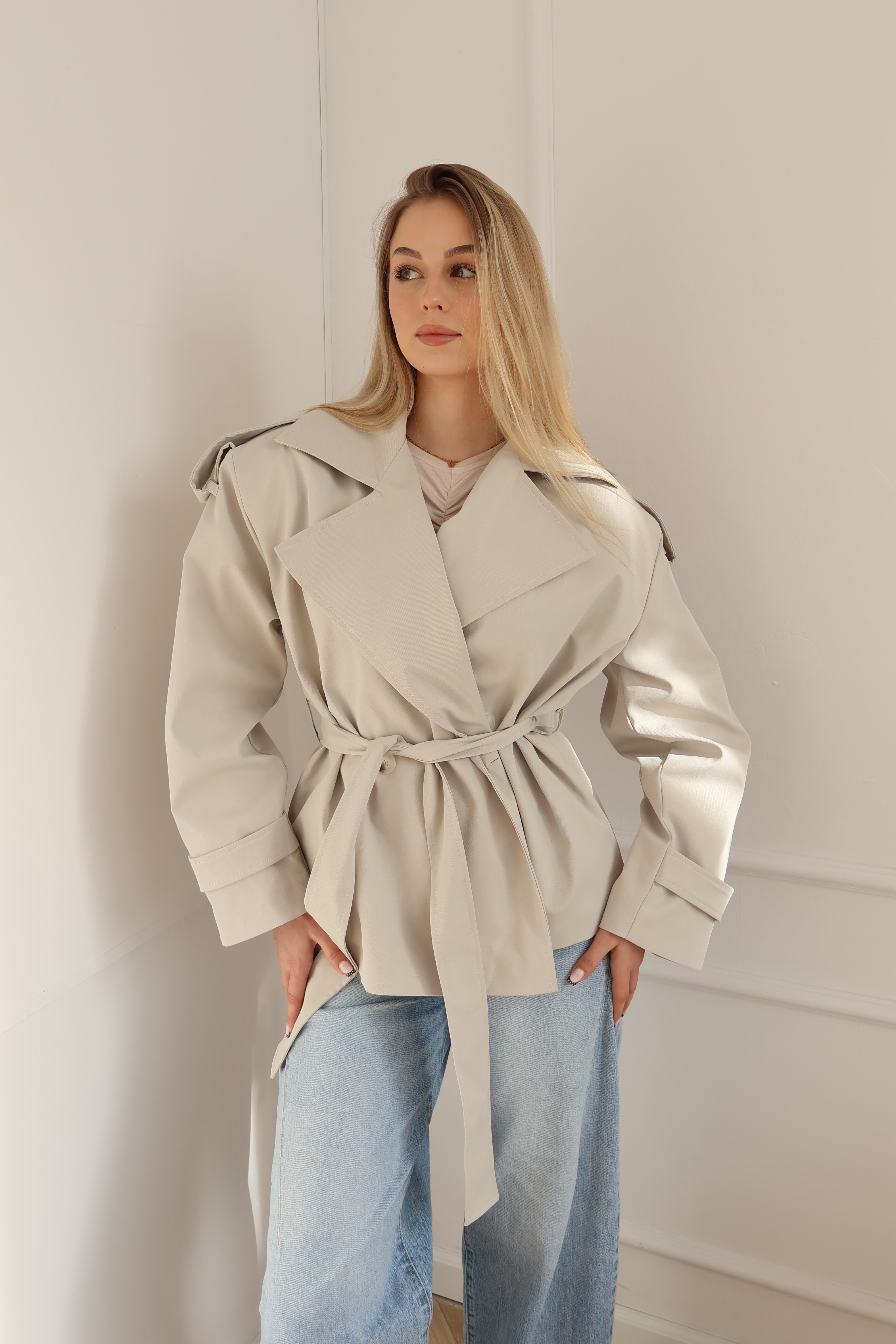 Elegancki trencz damski w jasnym, beżowym odcieniu – idealny na wiosnę i jesień. Lekki, z paskiem w talii, klasycznym kołnierzem i nowoczesnym krojem oversize. Wykonany z wysokiej jakości materiału, który zapewnia komfort noszenia i styl na co dzień oraz na wyjścia. Must-have w szafie każdej miłośniczki ponadczasowej mody.