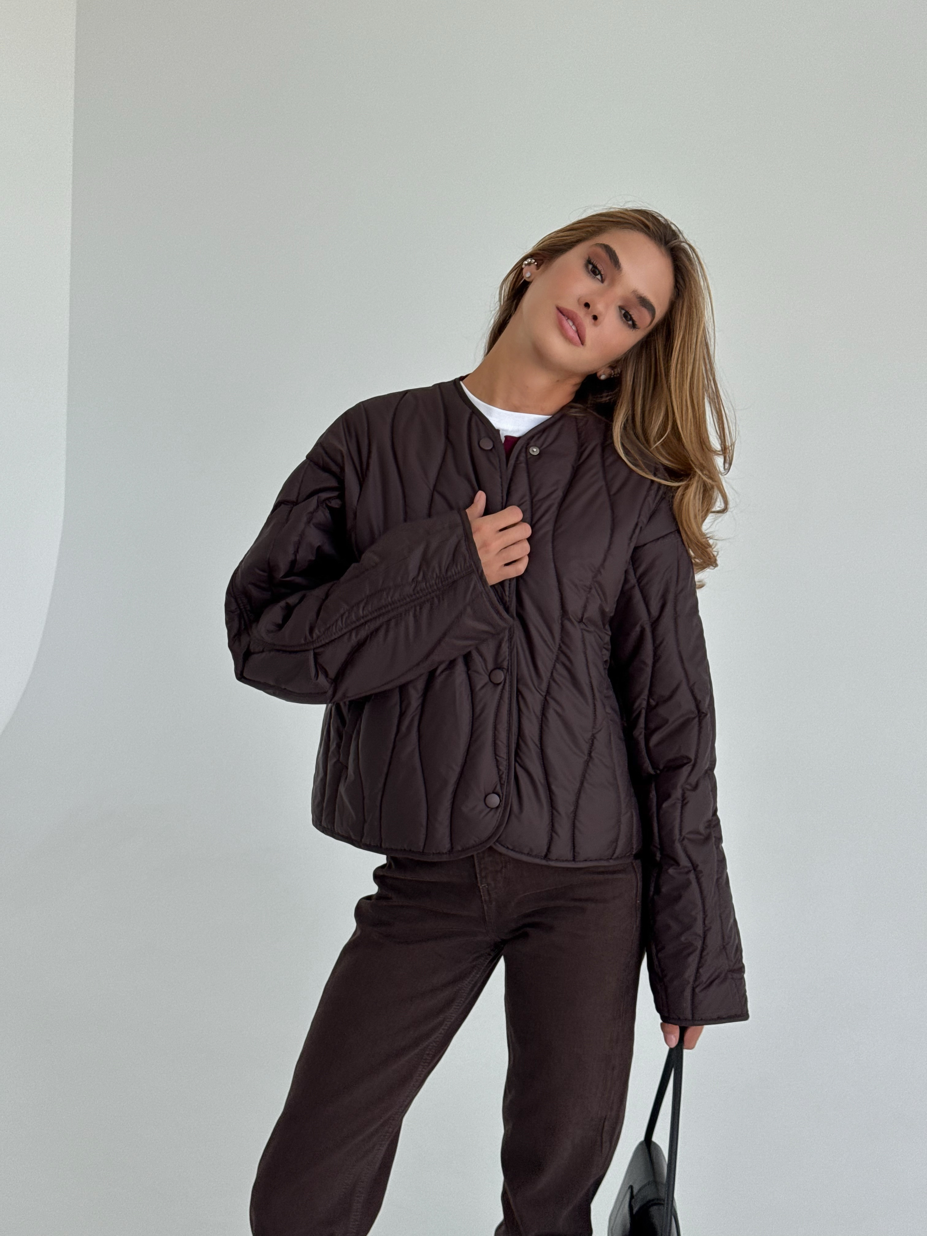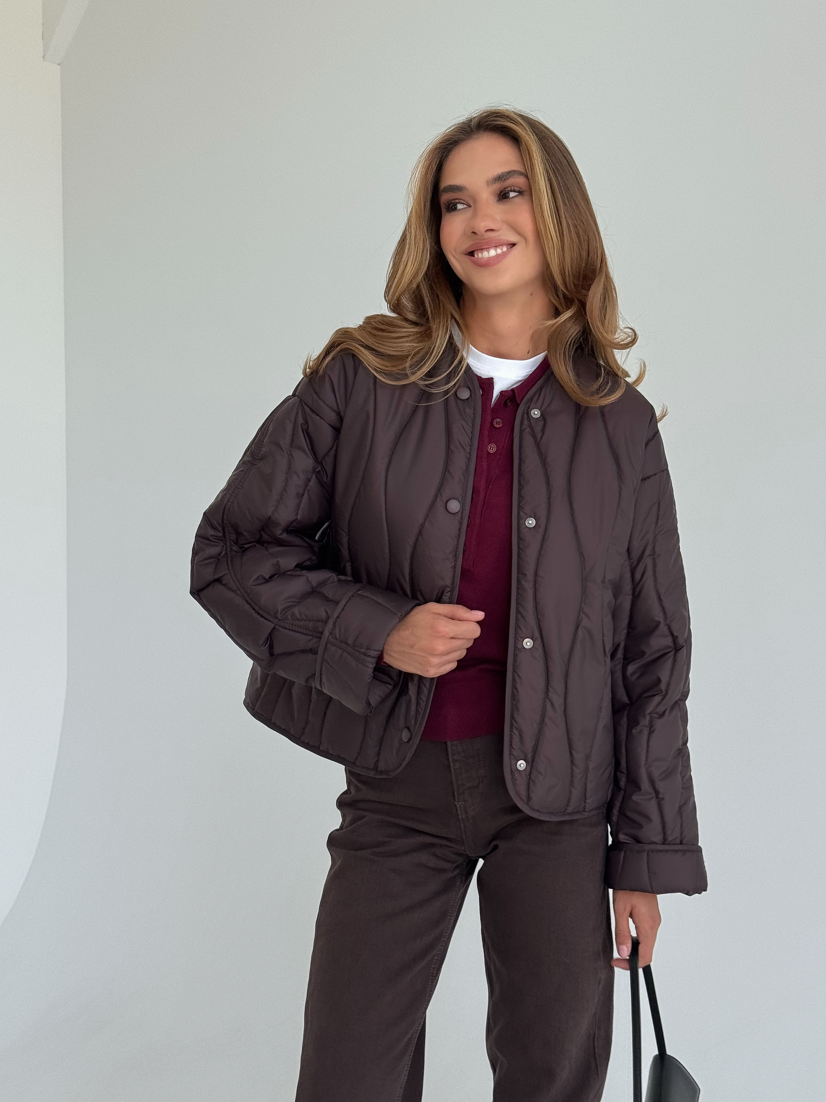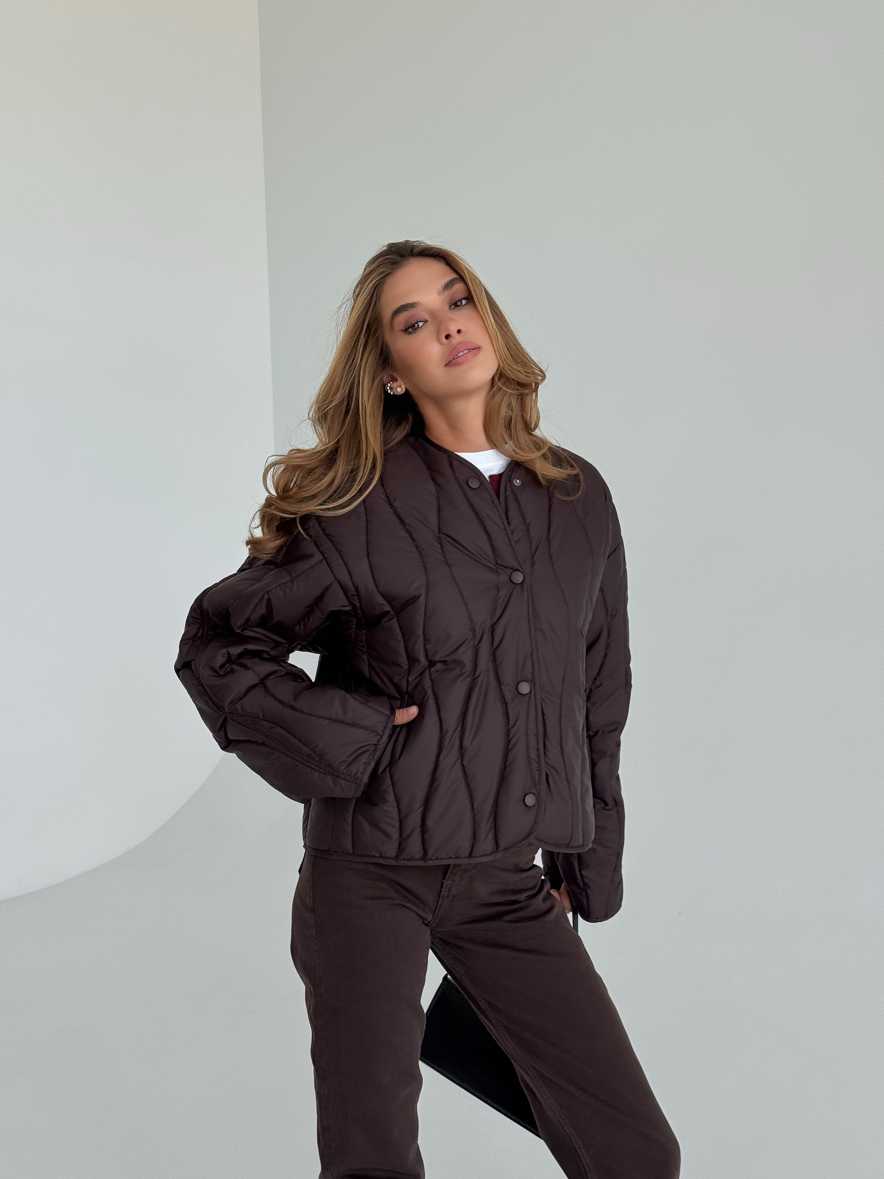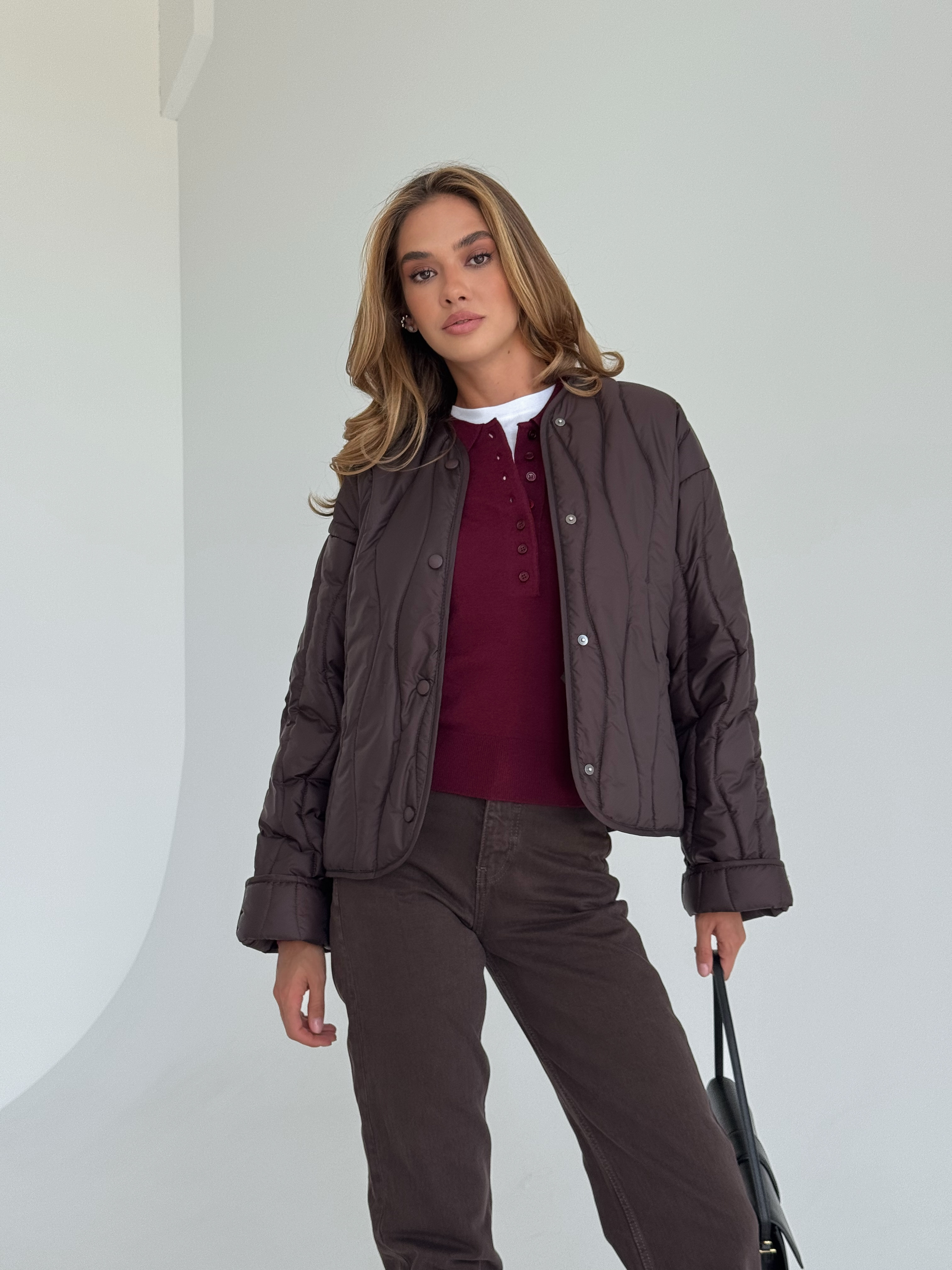Lekka, pikowana kurtka w modnym odcieniu czekoladowego brązu, idealna na sezon przejściowy. Luźniejszy krój zapewnia wygodę i świetnie komponuje się zarówno z jeansami, jak i eleganckimi stylizacjami. Zapinana na napy, doskonała na chłodniejsze wiosenne dni.
