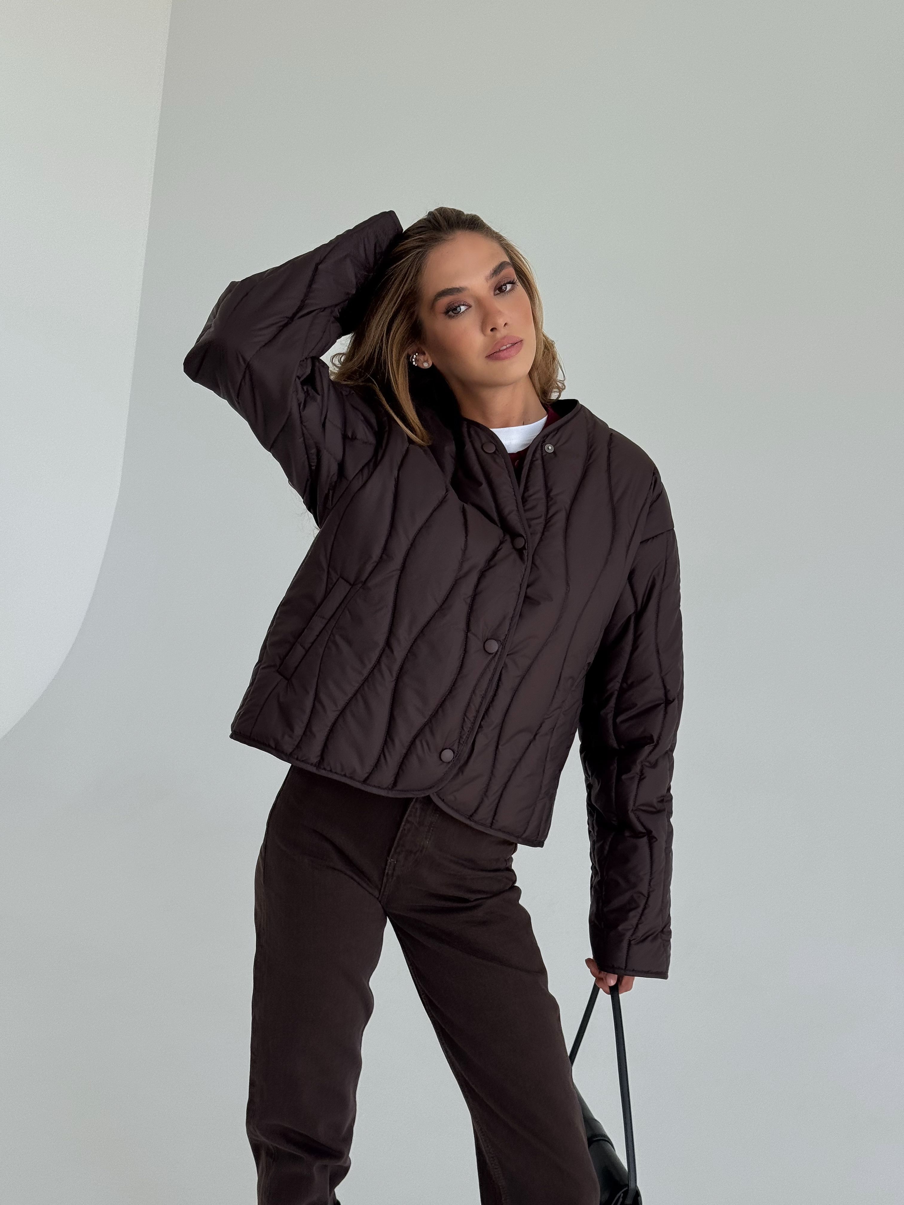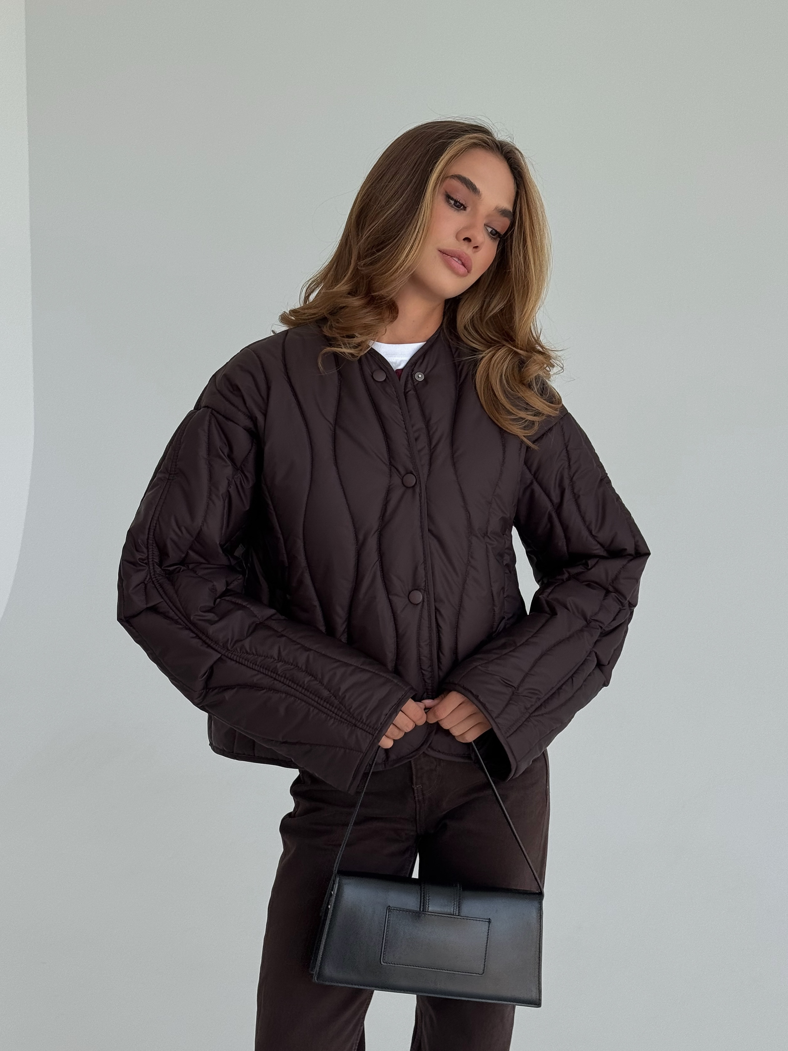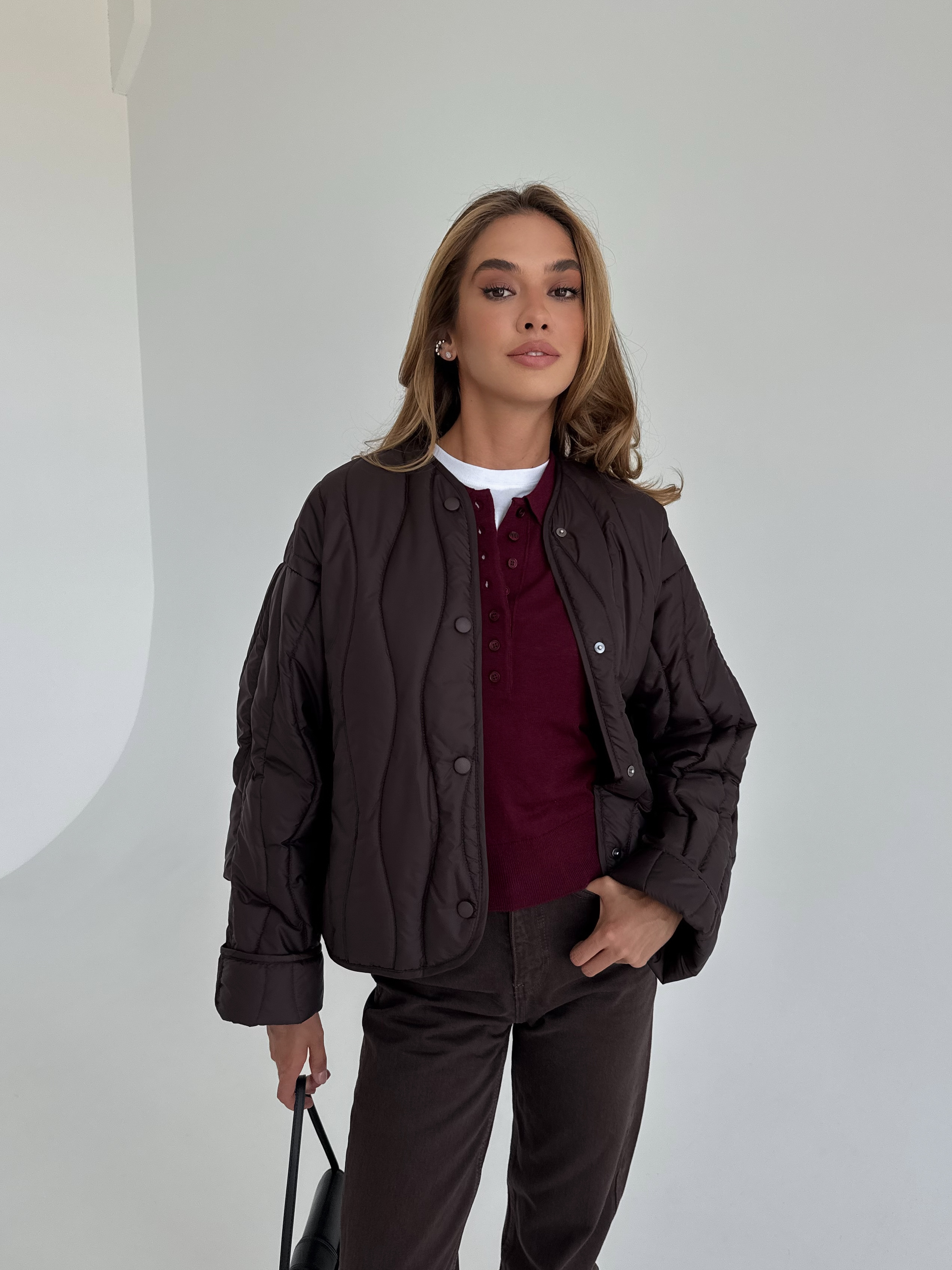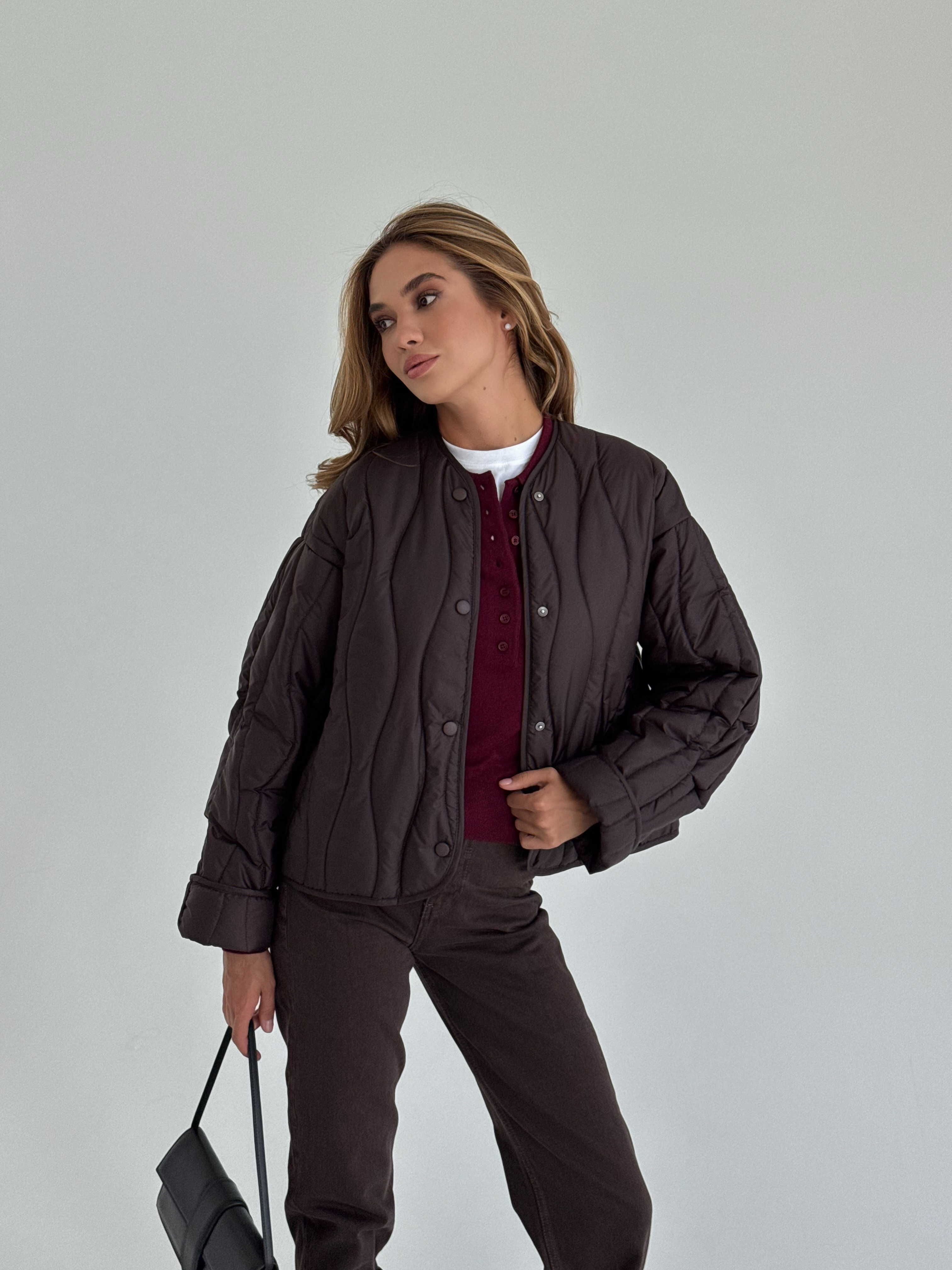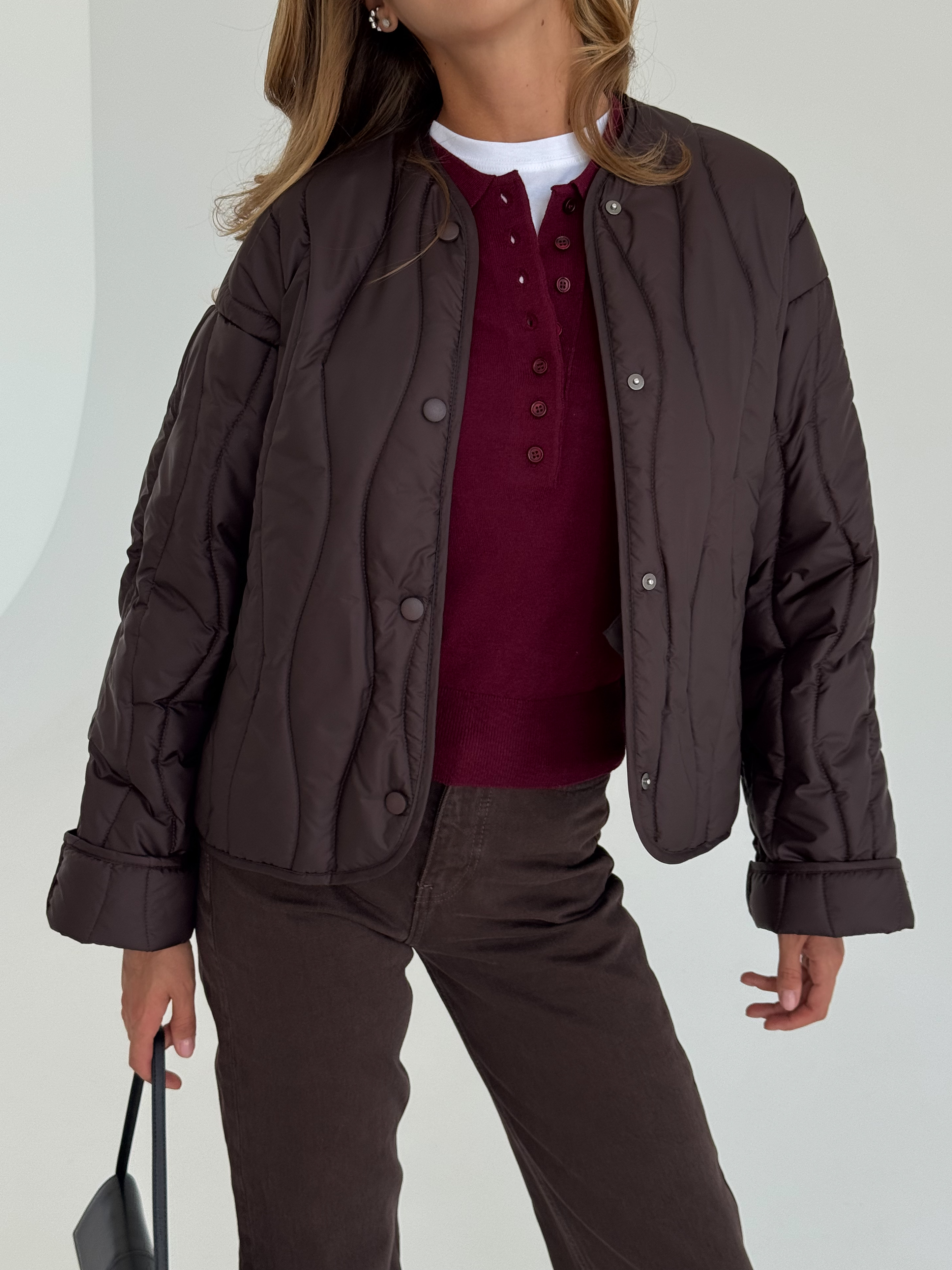 Lekka, pikowana kurtka w modnym odcieniu czekoladowego brązu, idealna na sezon przejściowy. Luźniejszy krój zapewnia wygodę i świetnie komponuje się zarówno z jeansami, jak i eleganckimi stylizacjami. Zapinana na napy, doskonała na chłodniejsze wiosenne dni.