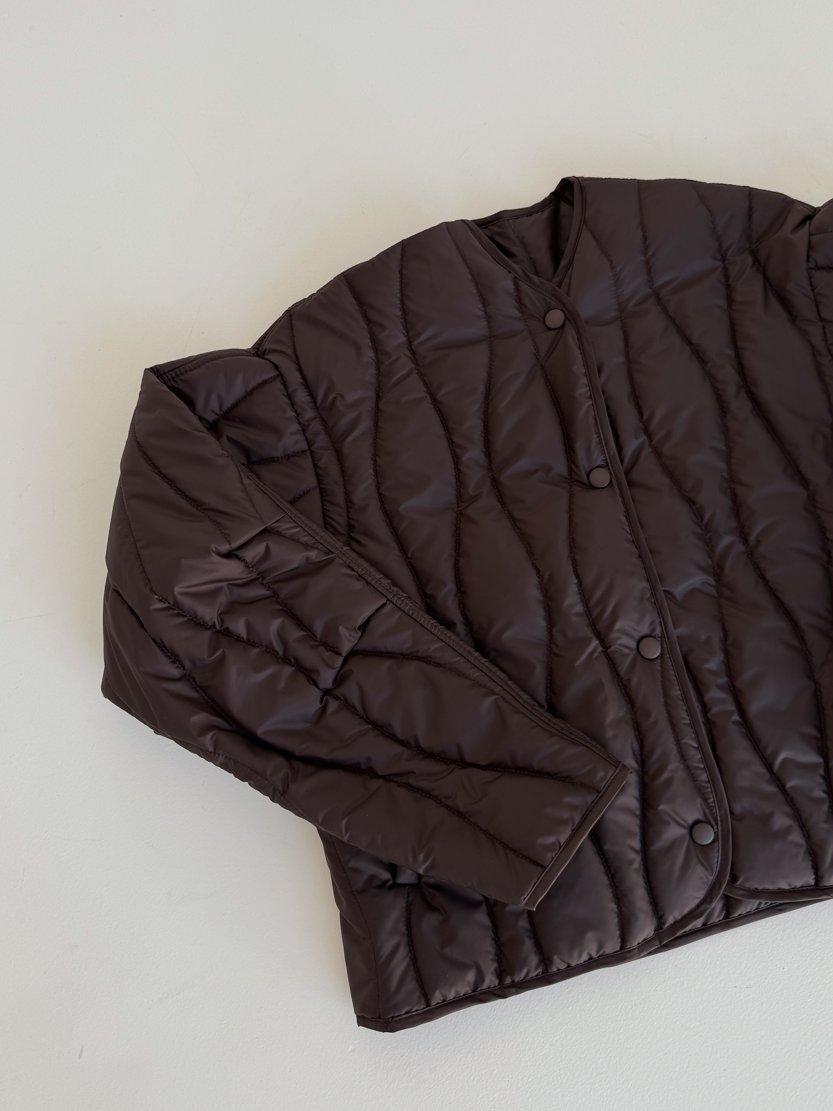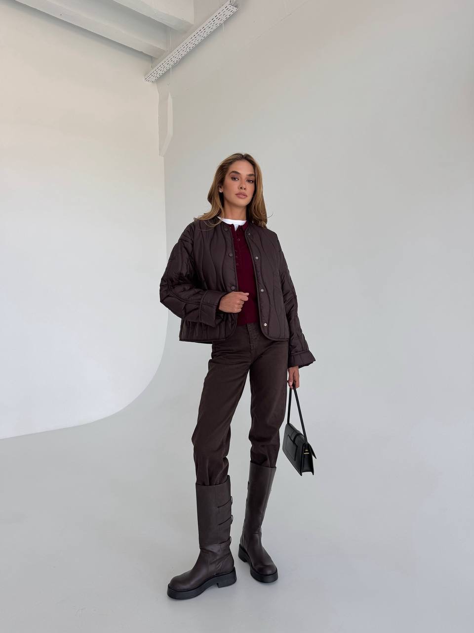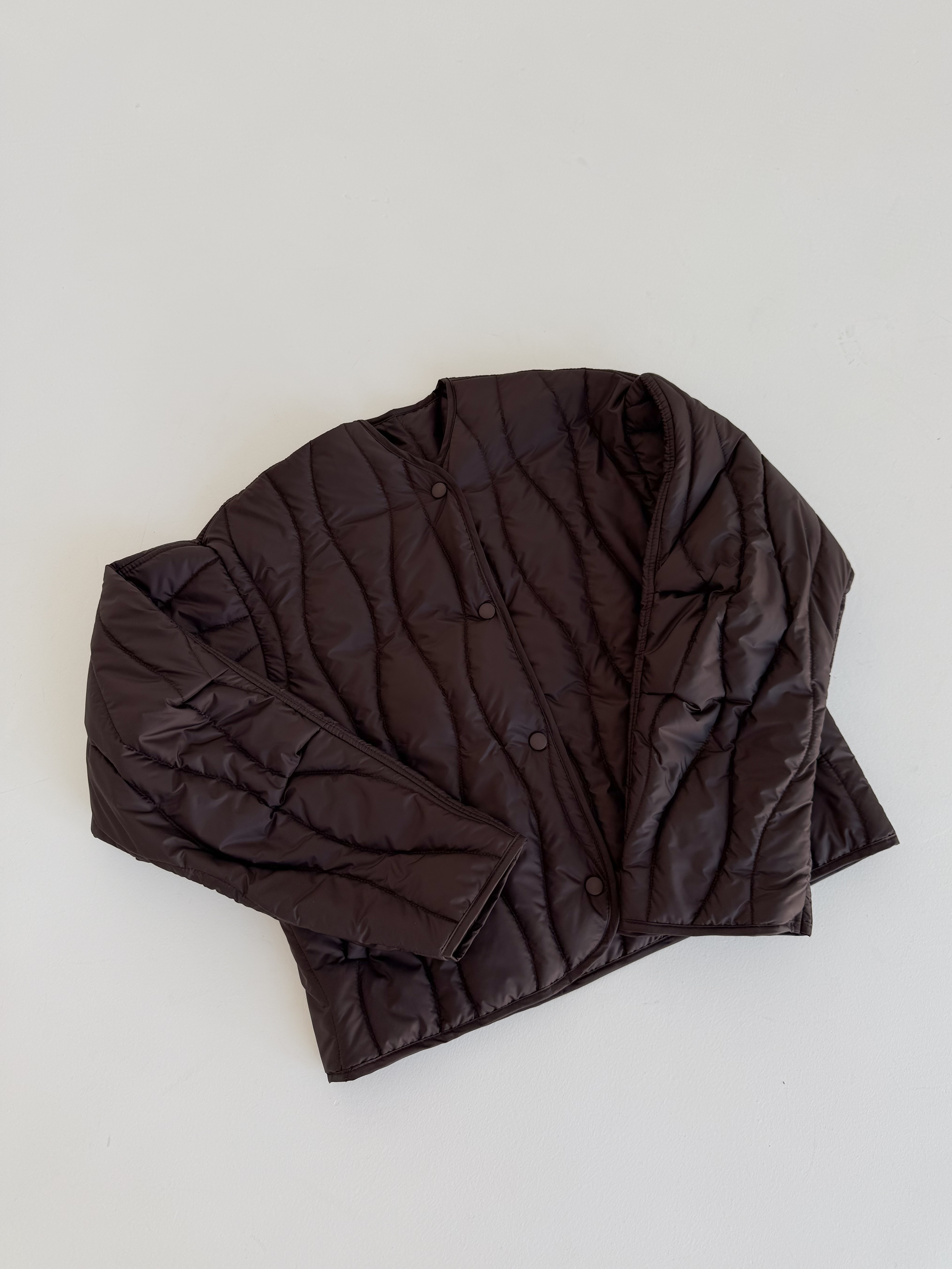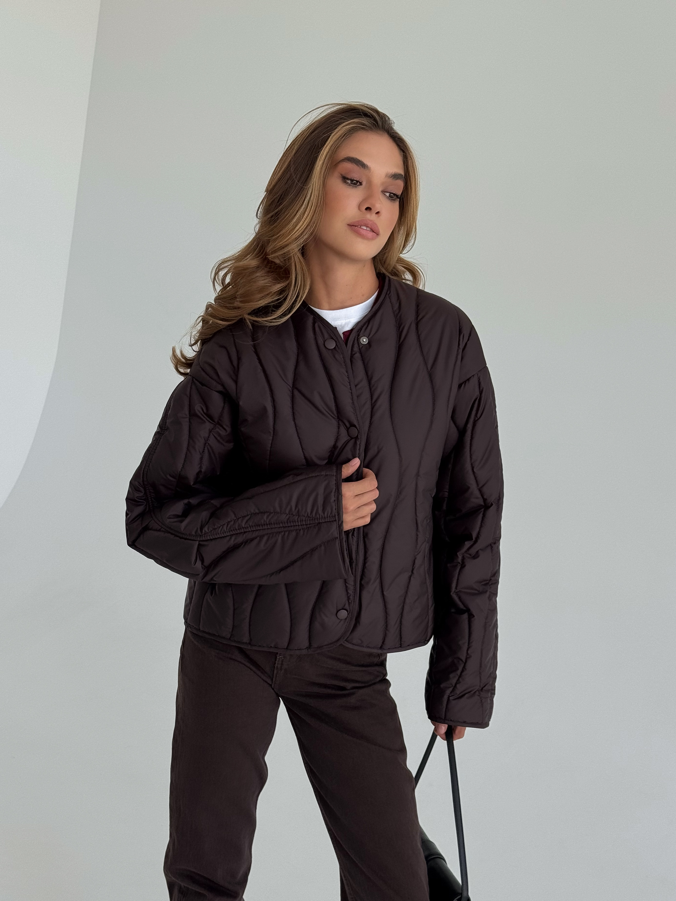 Lekka, pikowana kurtka w modnym odcieniu czekoladowego brązu, idealna na sezon przejściowy. Luźniejszy krój zapewnia wygodę i świetnie komponuje się zarówno z jeansami, jak i eleganckimi stylizacjami. Zapinana na napy, doskonała na chłodniejsze wiosenne dni.