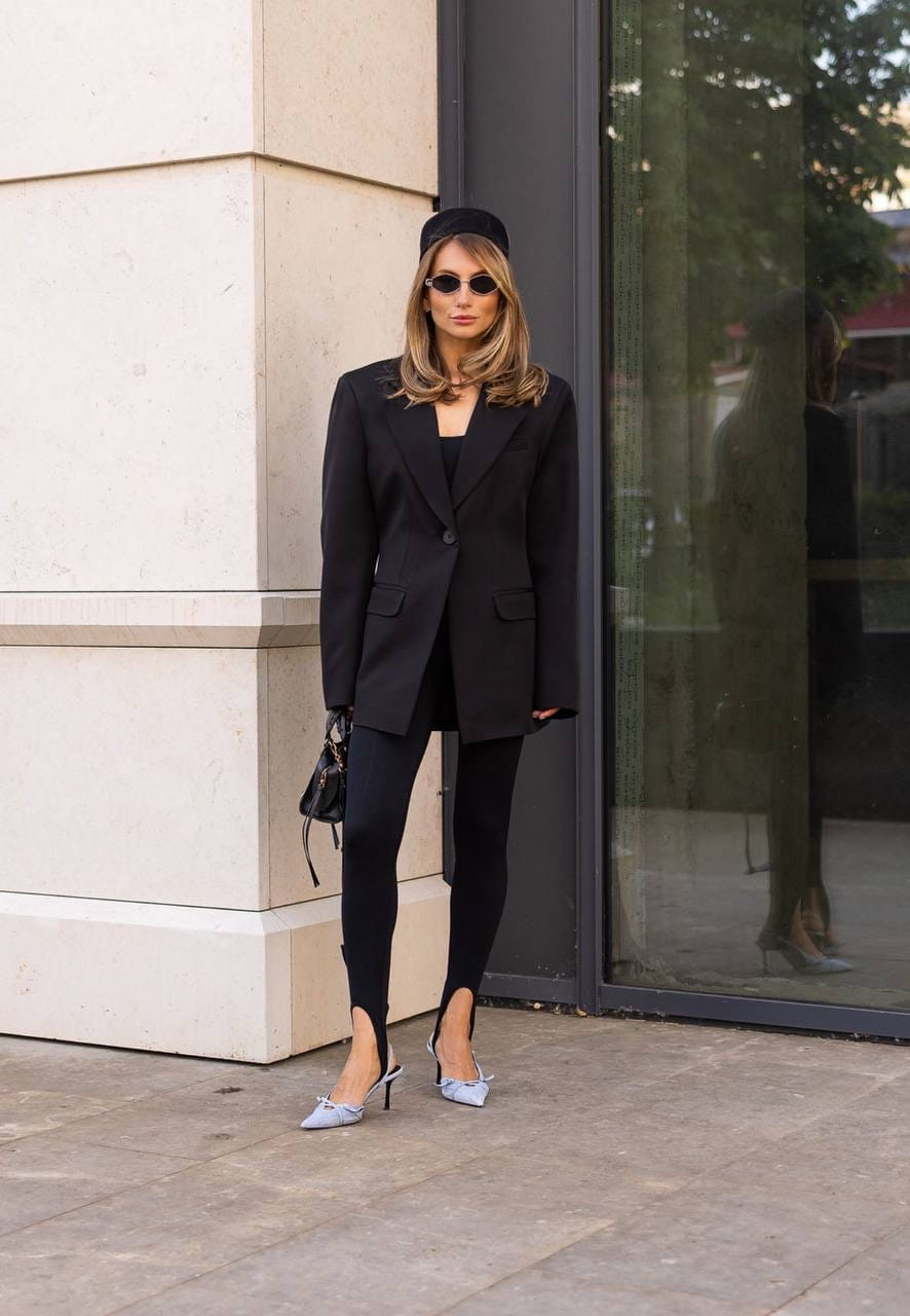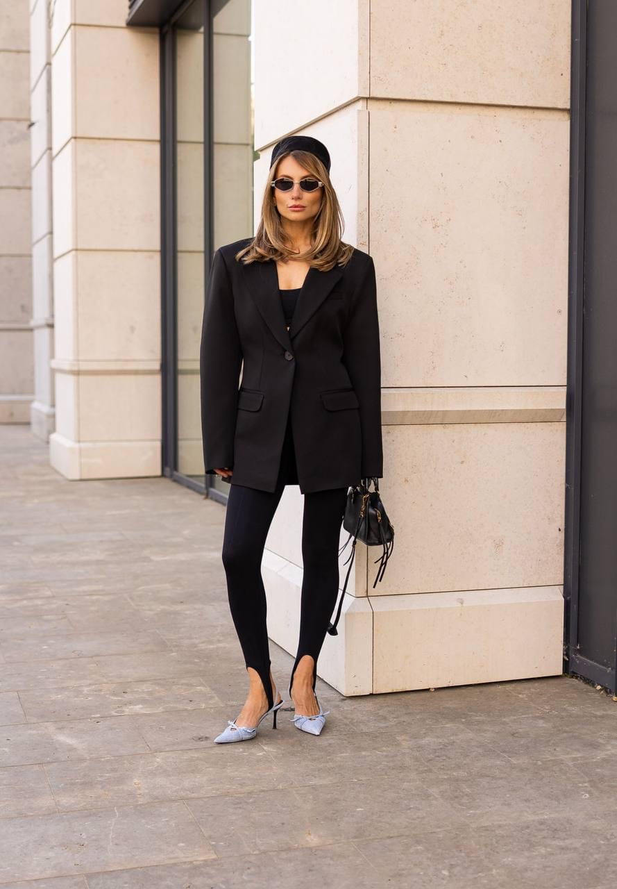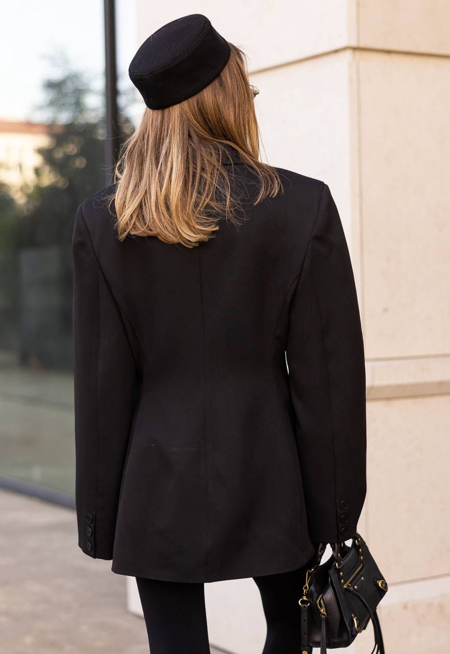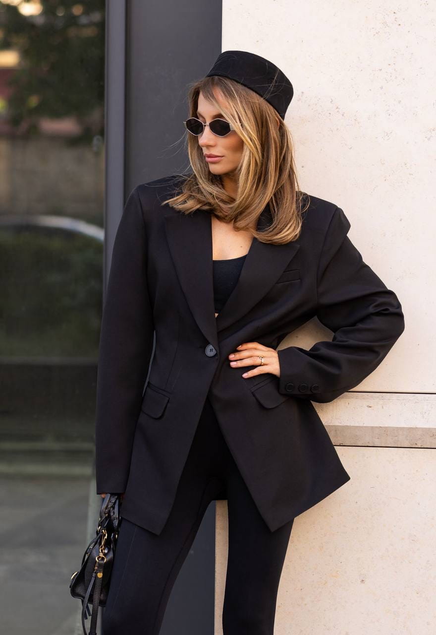 Czarna marynarka oversize o wydłużonym kroju. Jednorzędowe zapięcie na guzik, szerokie klapy i kieszenie z patkami. Klasyczna, a zarazem nowoczesna – idealna baza eleganckich stylizacji.
