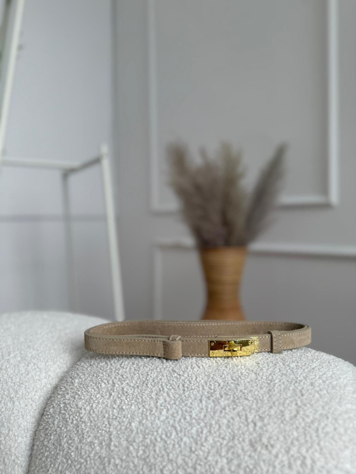 Ten delikatny, ręcznie wykonany pasek ze skóry naturalnej to połączenie klasycznej elegancji i ponadczasowego stylu. Utrzymany w odcieniu subtelnego beżu, idealnie dopełni zarówno codzienne, jak i bardziej formalne stylizacje. Złota klamra nawiązuje formą do kultowego zapięcia typu “turn-lock”, dodając całości szykownego charakteru.