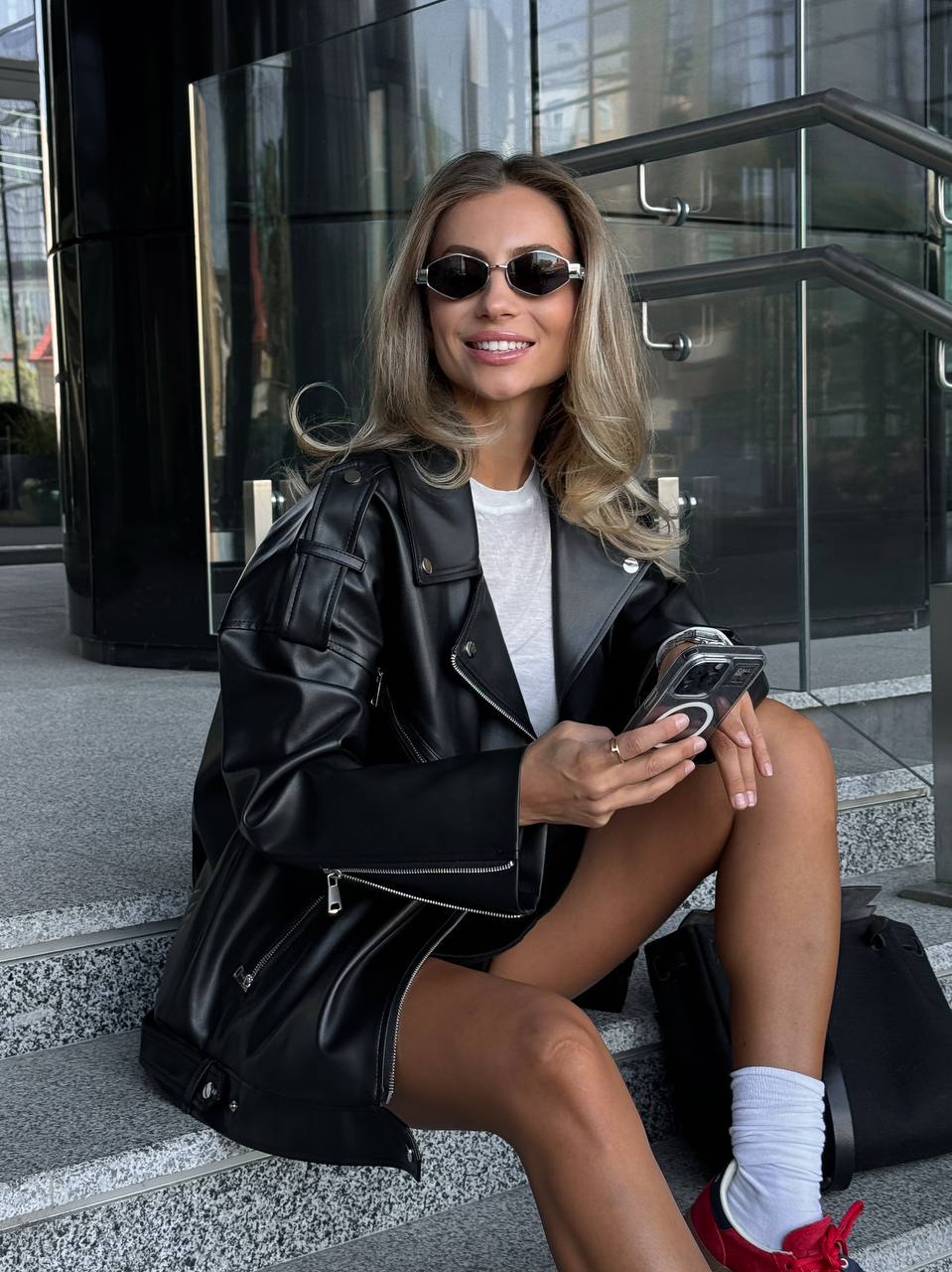 Kurtka pilotka wykonana z eko skóry, o oversizowym kroju. Wiązanie dodające charakteru, bardzo delikatna skóra. Model na sezon wiosenny/jesienny.