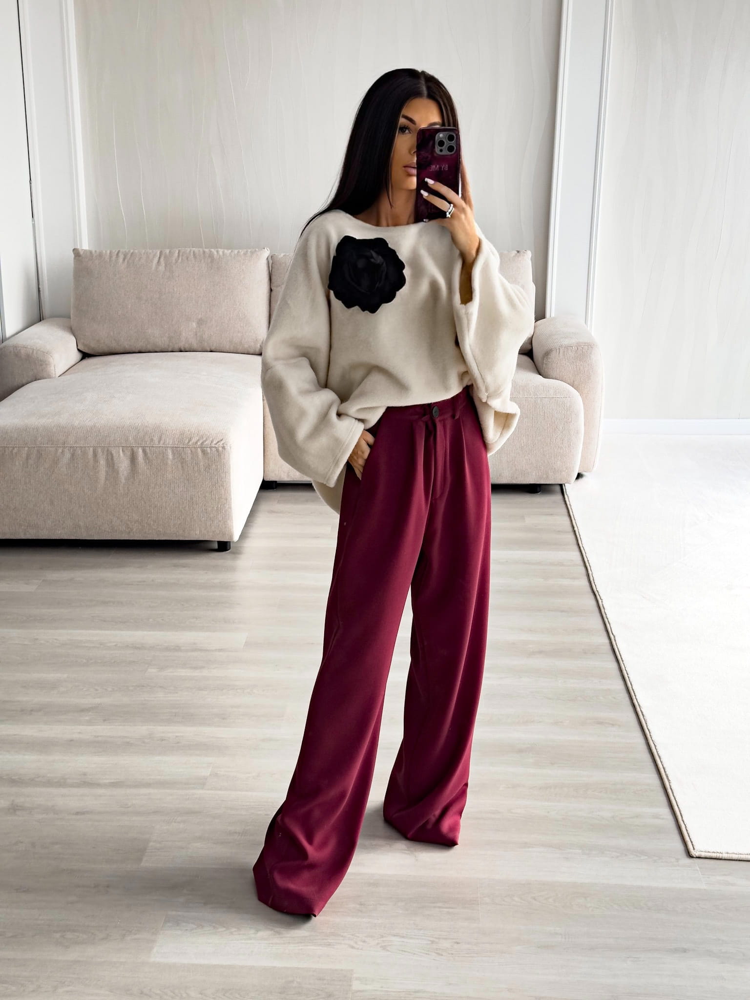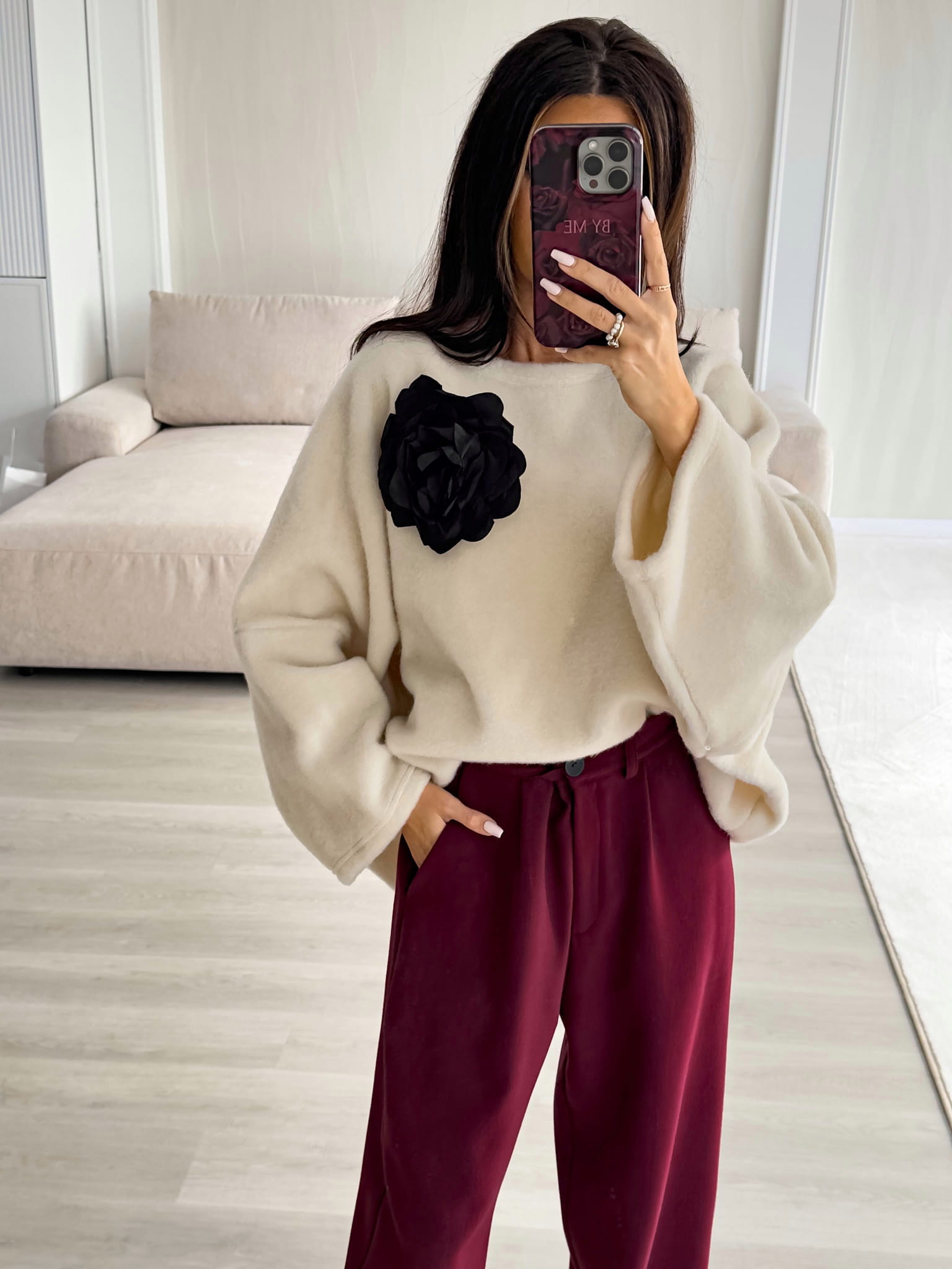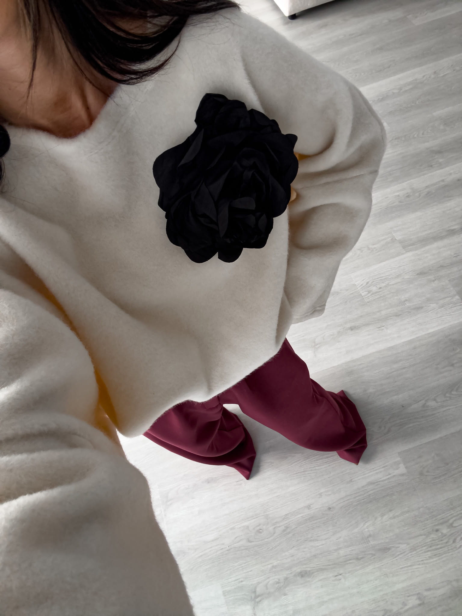 Wełniany sweter o oversizowym kroju. Wykonany z miękkiej i przyjemnej w dotyku wełny. Gruby i mięsisty, dzięki czemu świetnie nadaje się na chłodniejsze dni i wieczory.