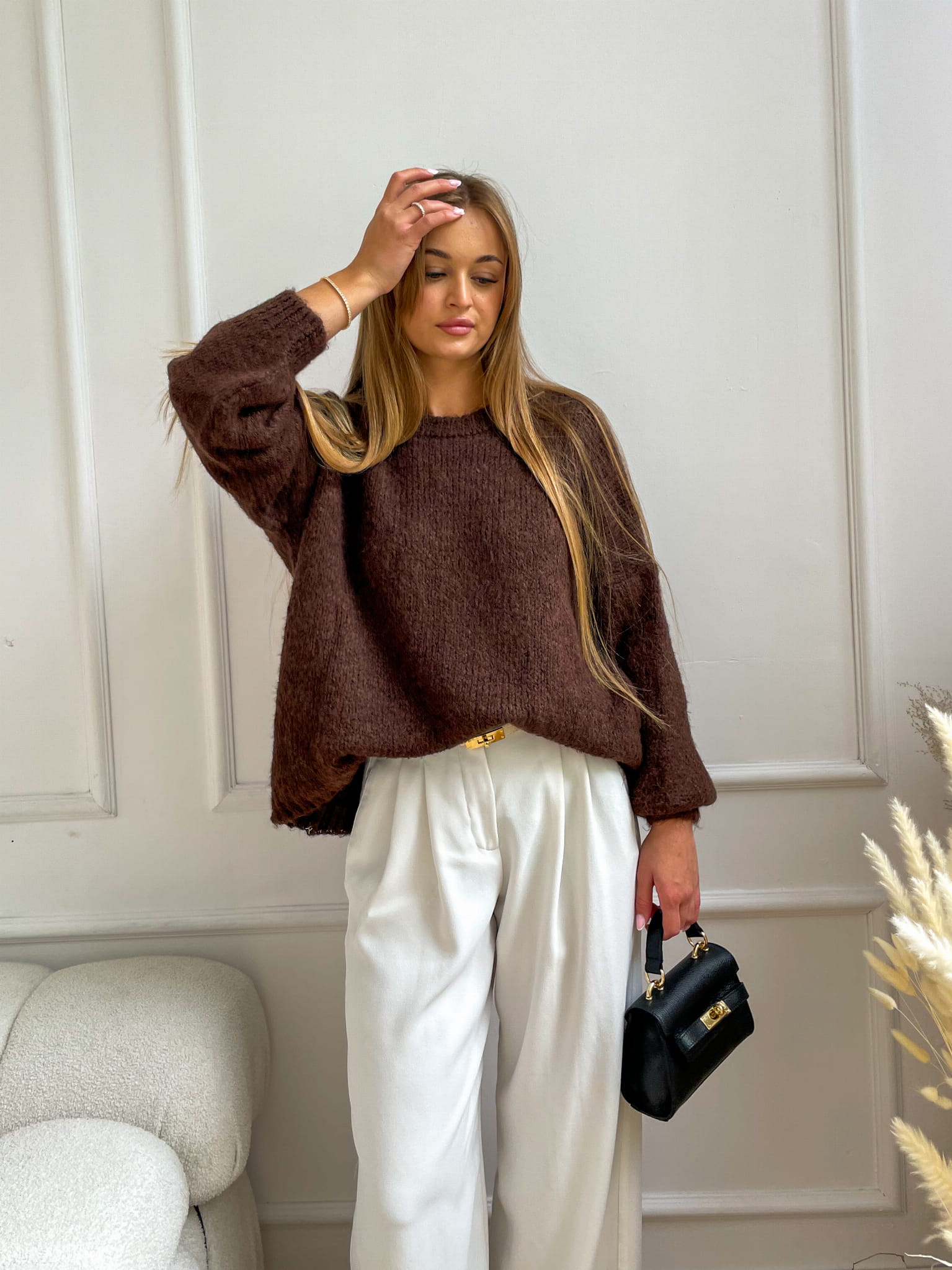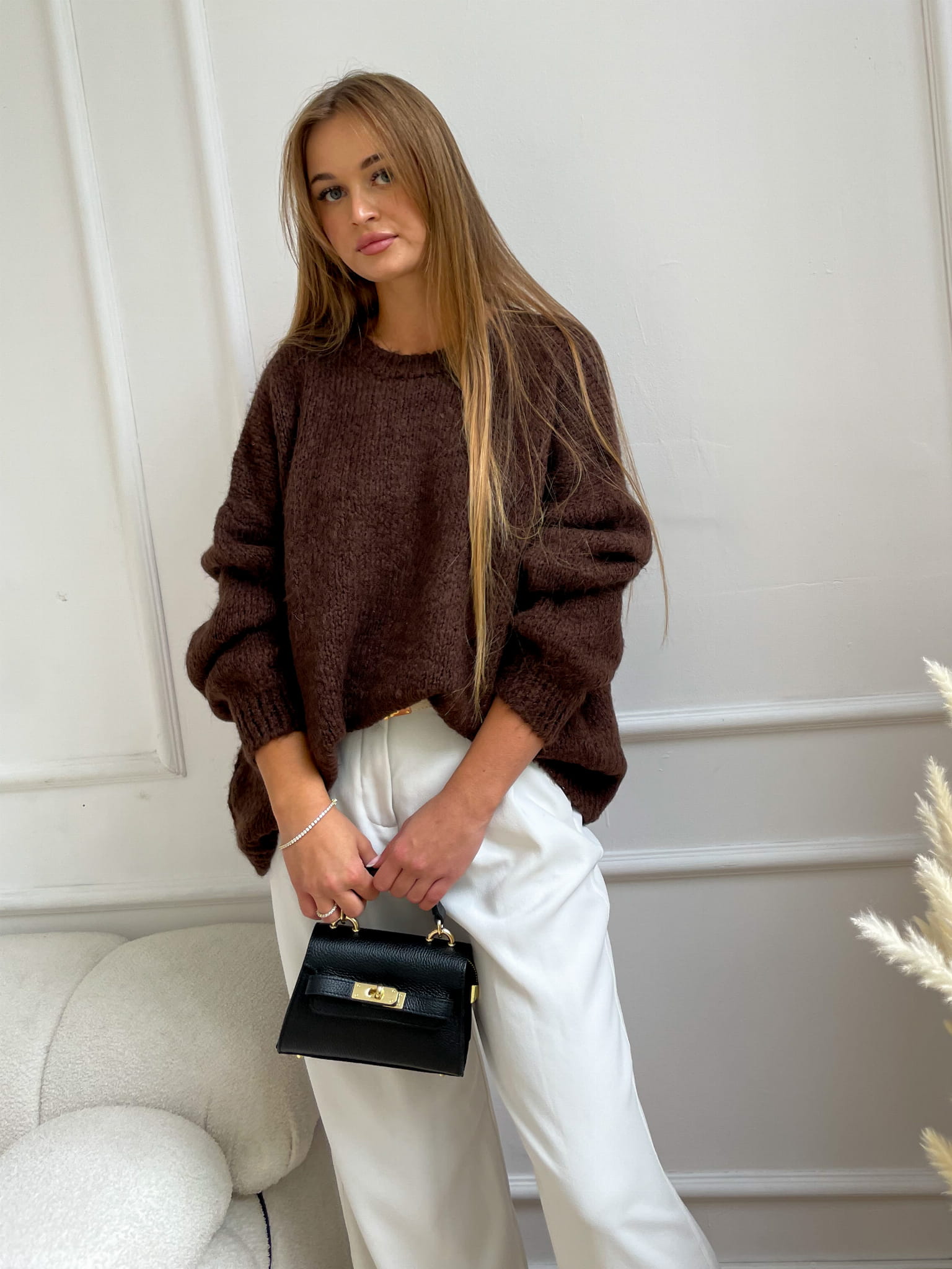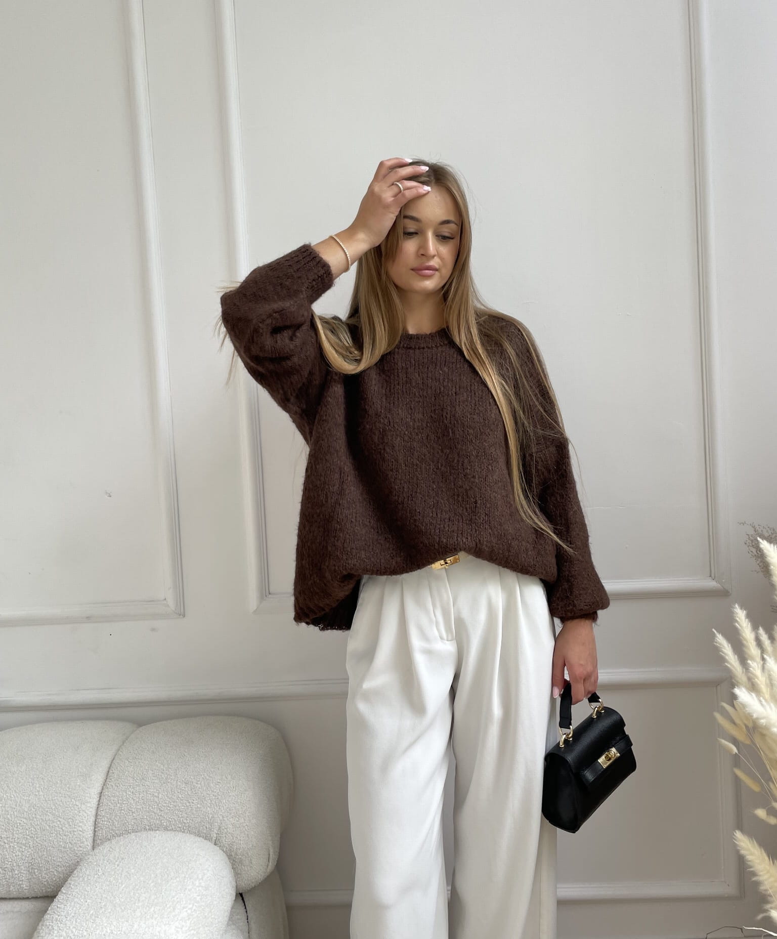 Miękki sweter w odcieniu czekoladowym o luźnym kroju i subtelnej fakturze. Bufiaste rękawy nadają mu lekkości, a minimalistyczny design sprawia, że pasuje zarówno do codziennych, jak i eleganckich stylizacji.