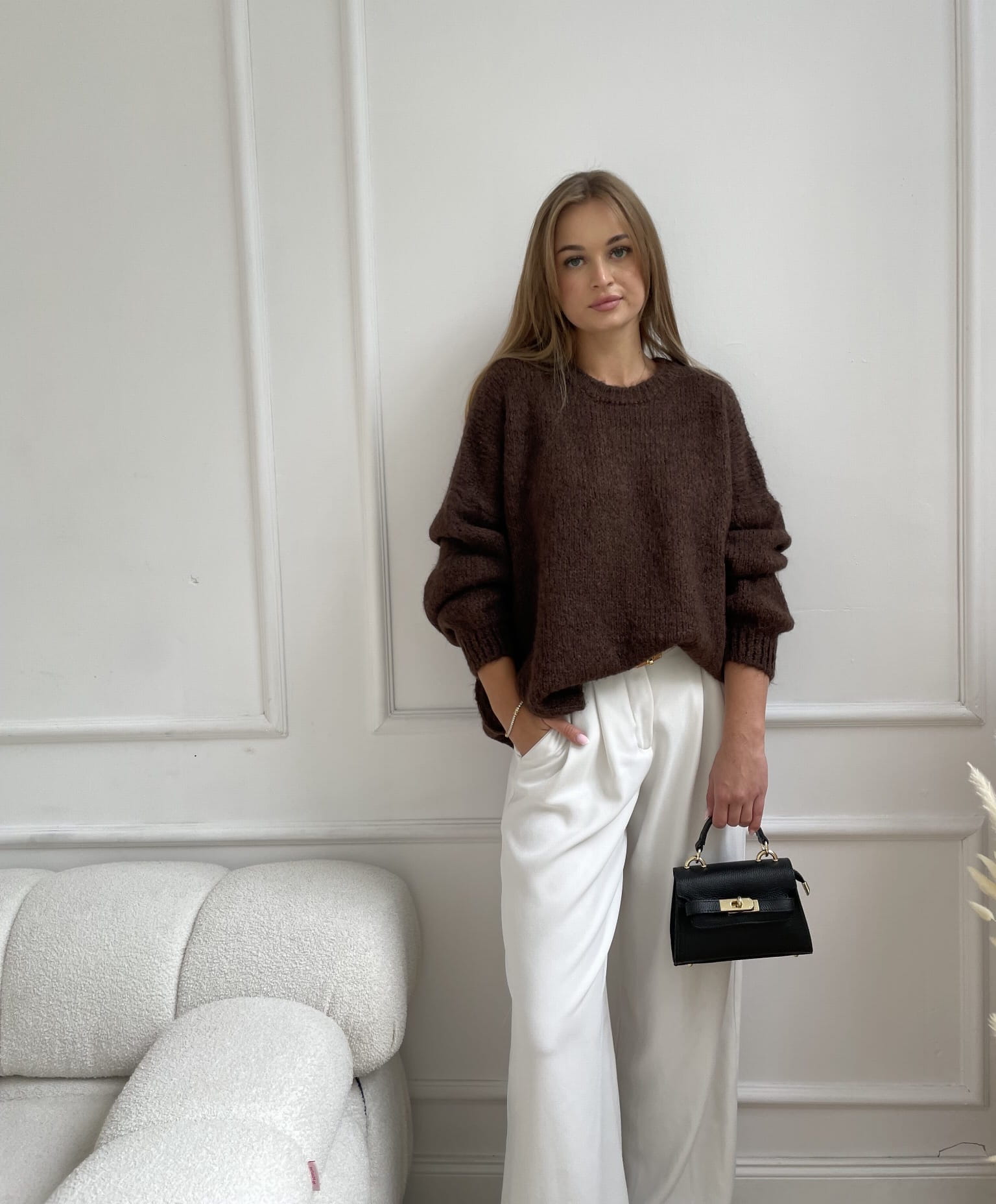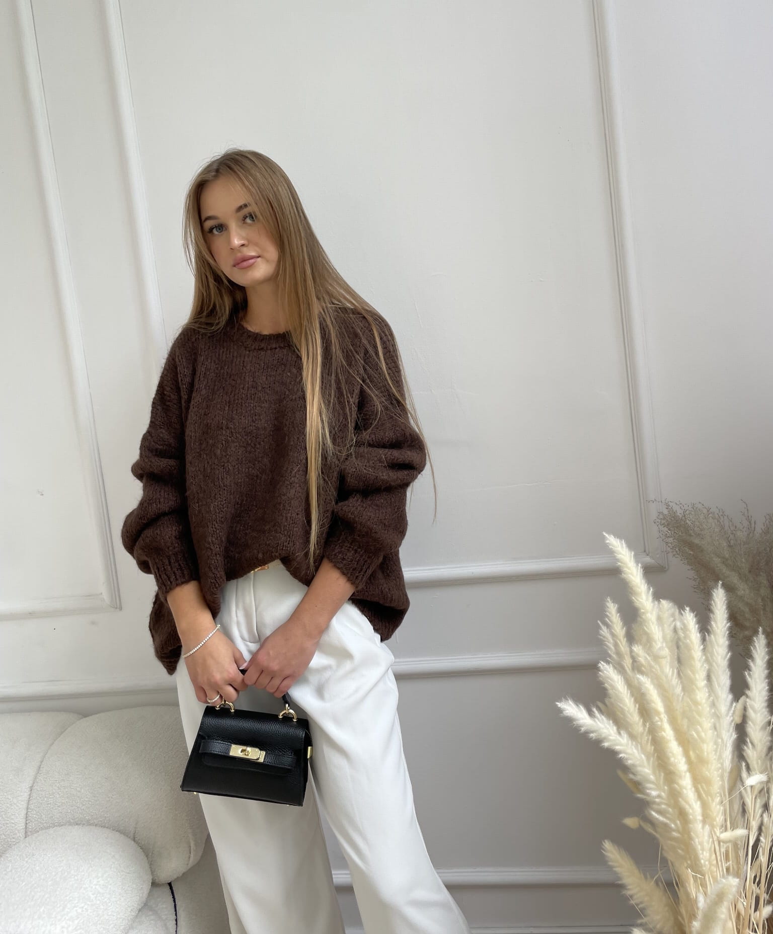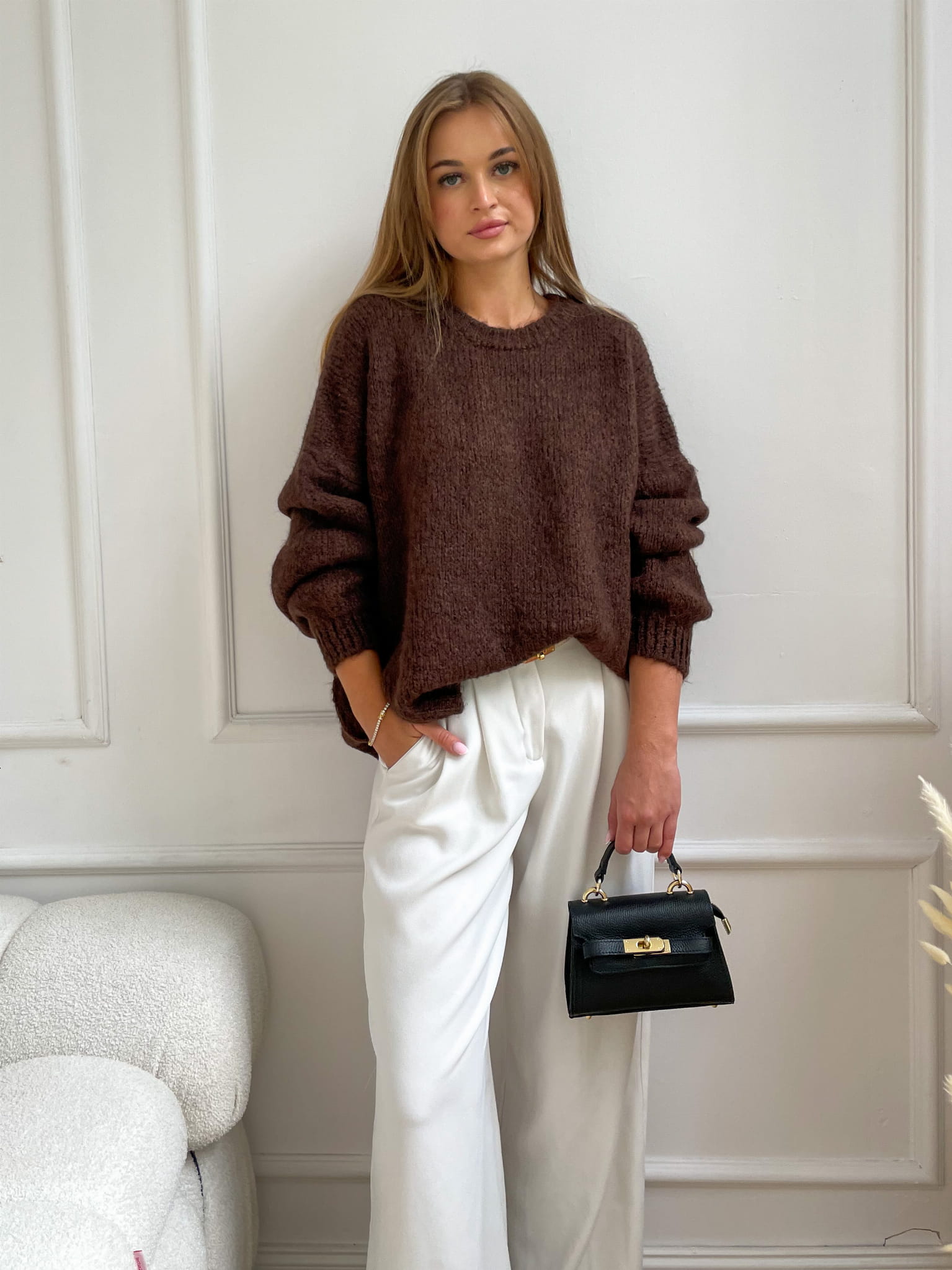 Miękki sweter w odcieniu czekoladowym o luźnym kroju i subtelnej fakturze. Bufiaste rękawy nadają mu lekkości, a minimalistyczny design sprawia, że pasuje zarówno do codziennych, jak i eleganckich stylizacji.