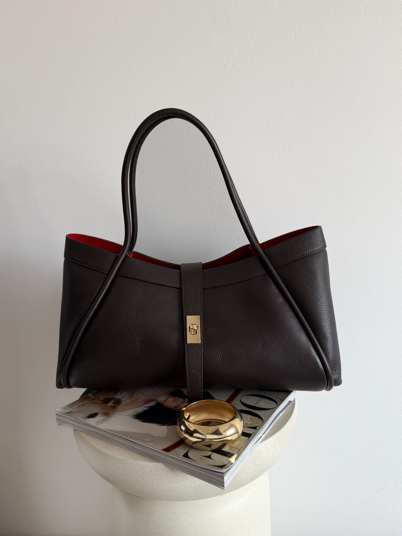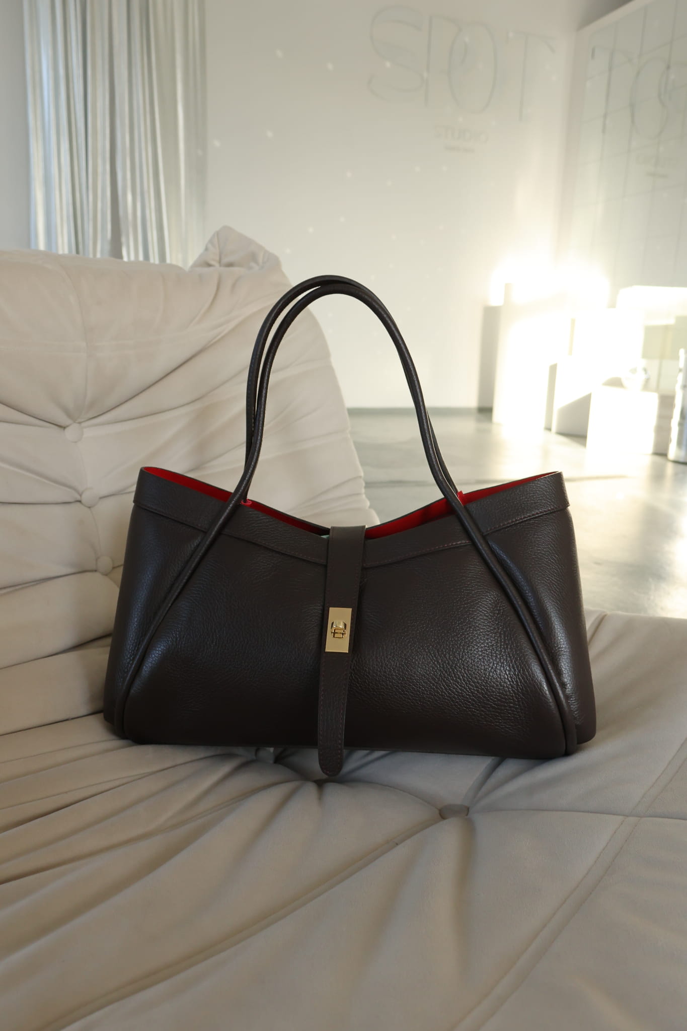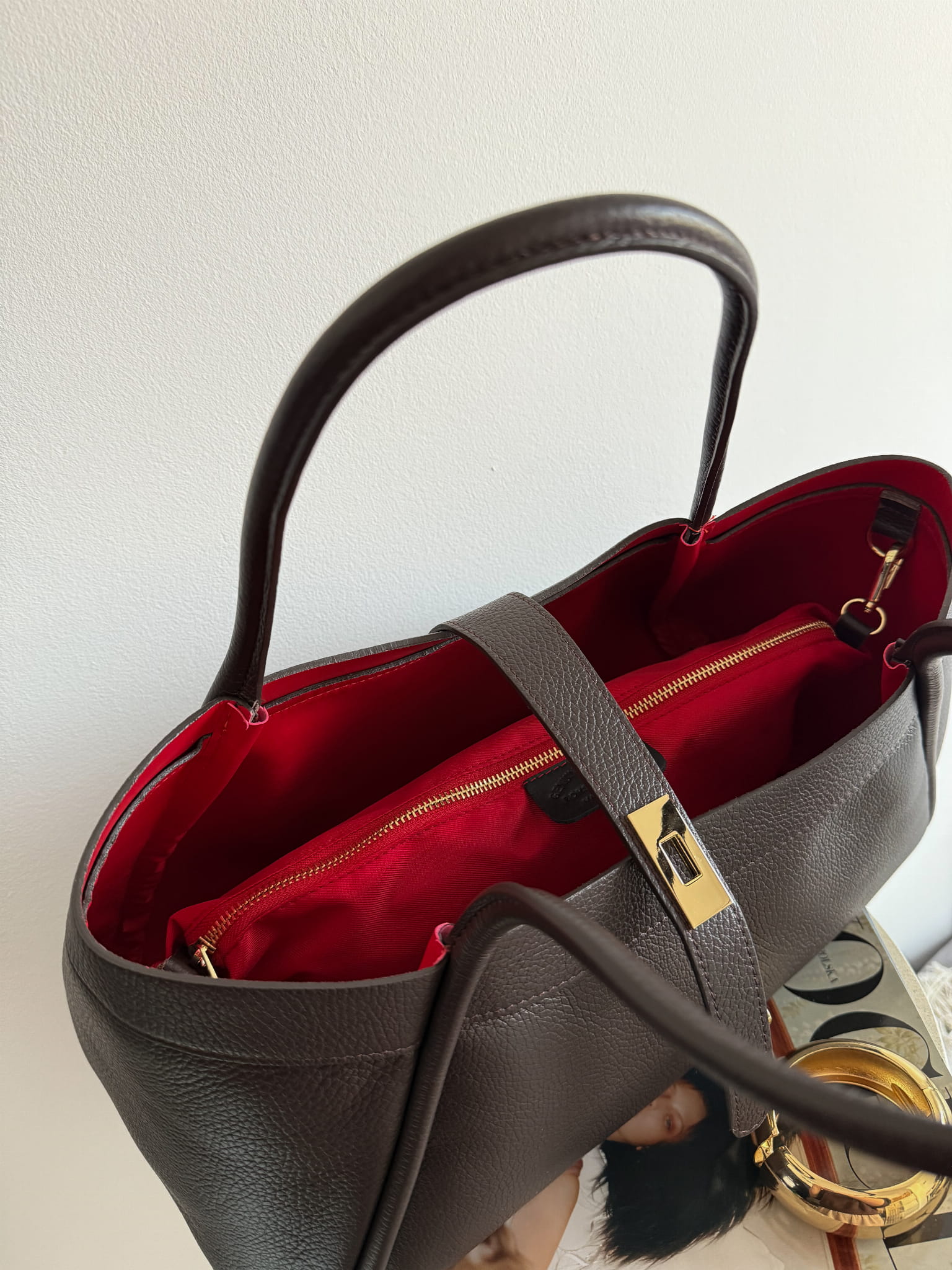 Stylowa torebka wykonana z naturalnej skóry w eleganckim brązowym kolorze. Wykończona skórą naturalną i ozdobiona subtelnym złotym zapięciem. Wnętrze w kontrastowym czerwonym kolorze dodaje charakteru, a dołączona praktyczna kosmetyczka ułatwia organizację. Idealna na co dzień i na wyjątkowe okazje.