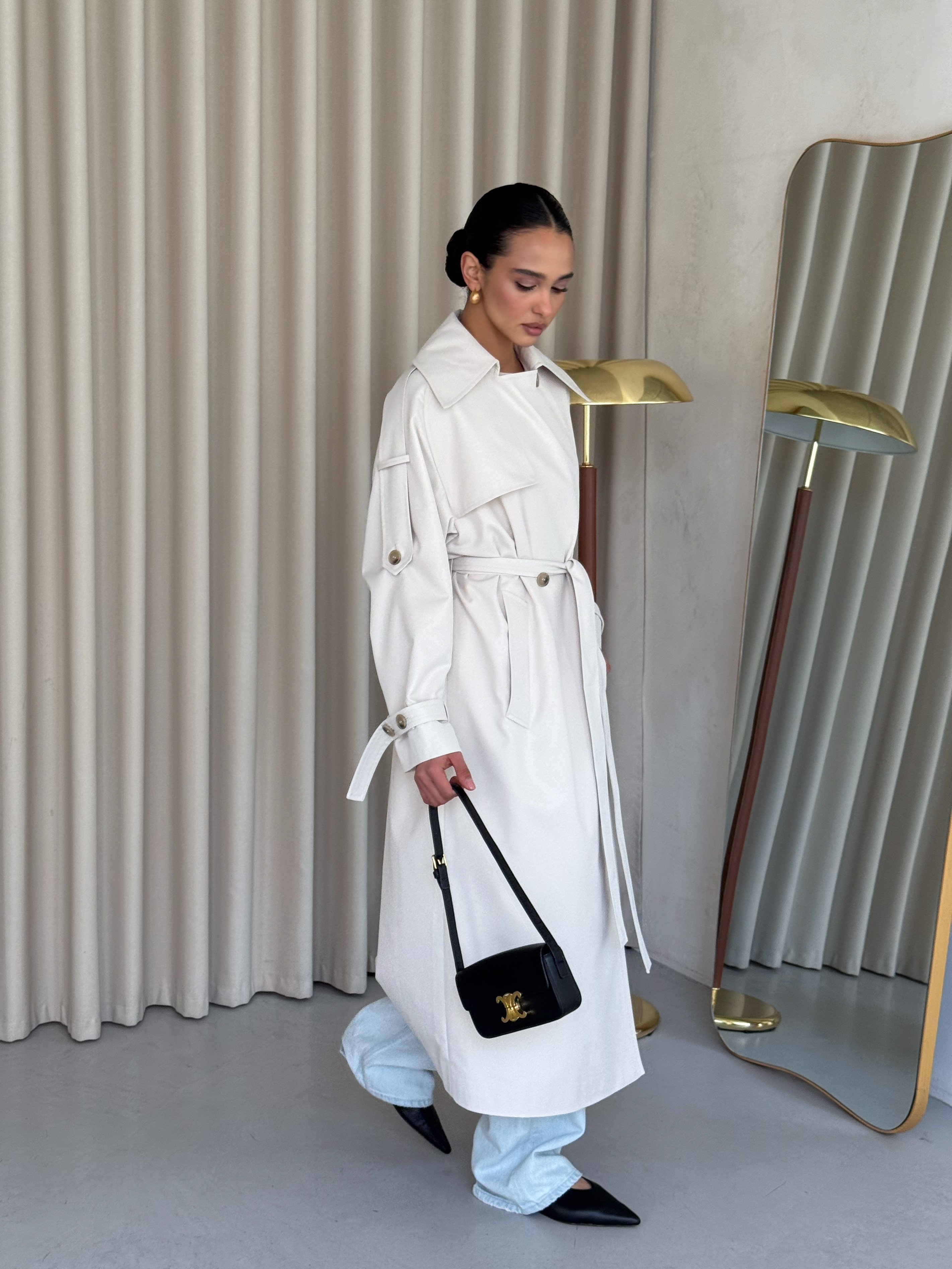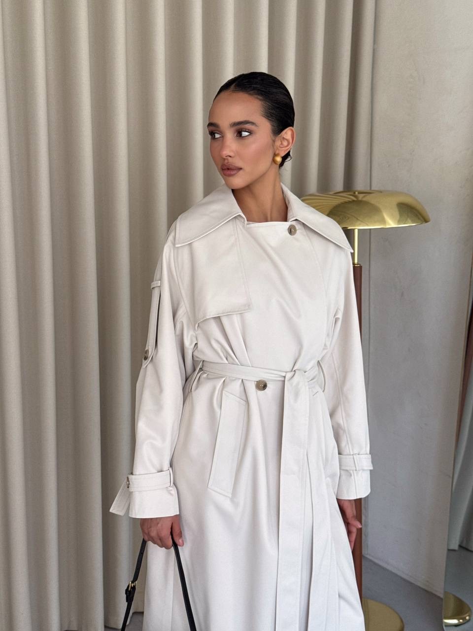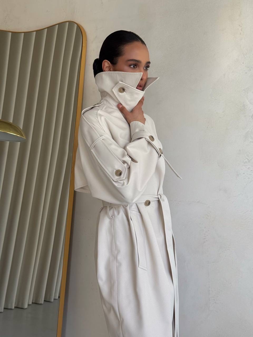 Klasyczny trencz damski wykonany z wysokiej jakości, grubej 100% bawełny. Ponadczasowy fason z wiązaniem w talii podkreśla sylwetkę i sprawia, że płaszcz pasuje zarówno do codziennych, jak i eleganckich stylizacji.