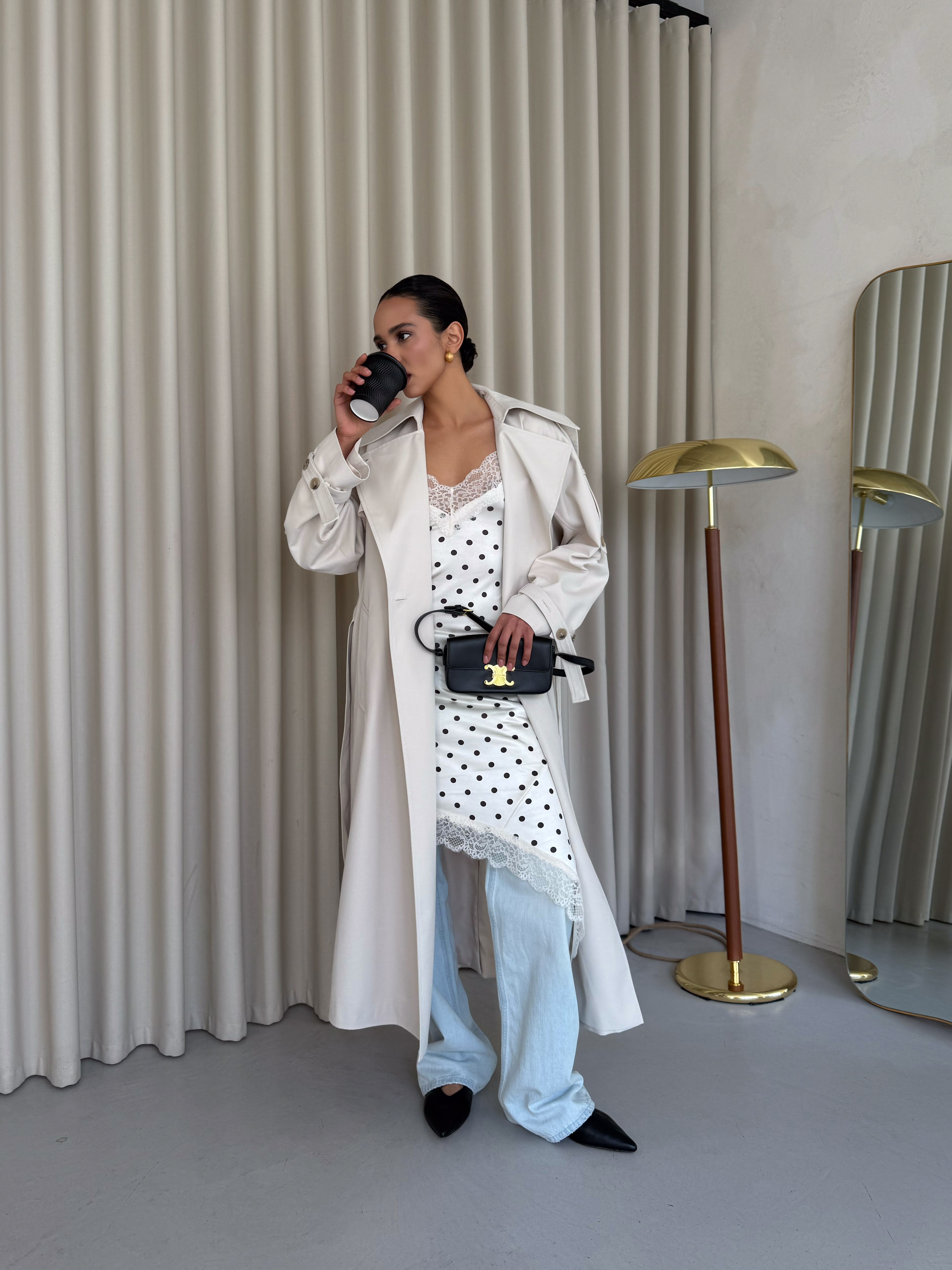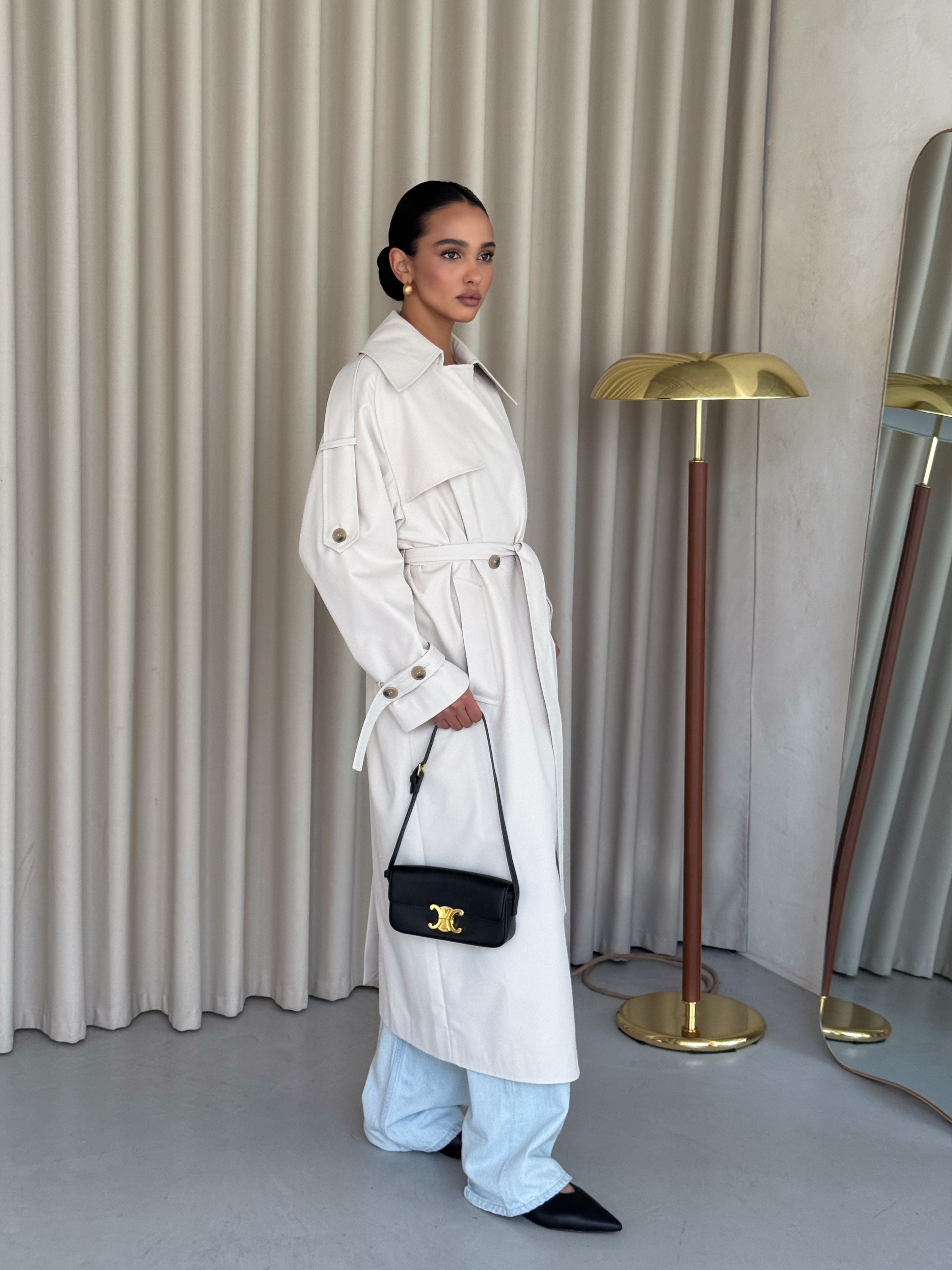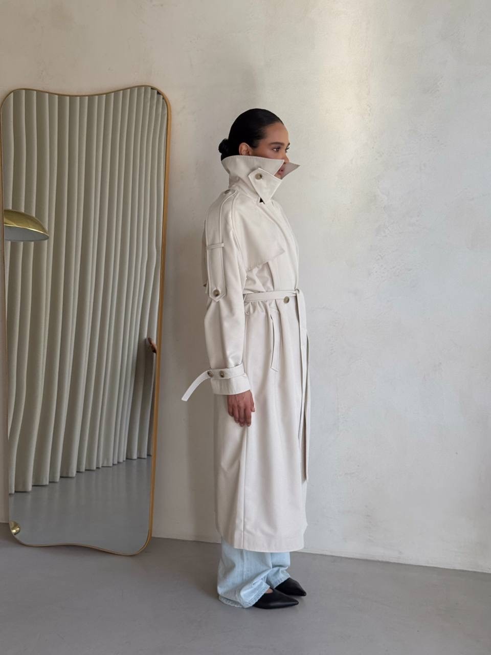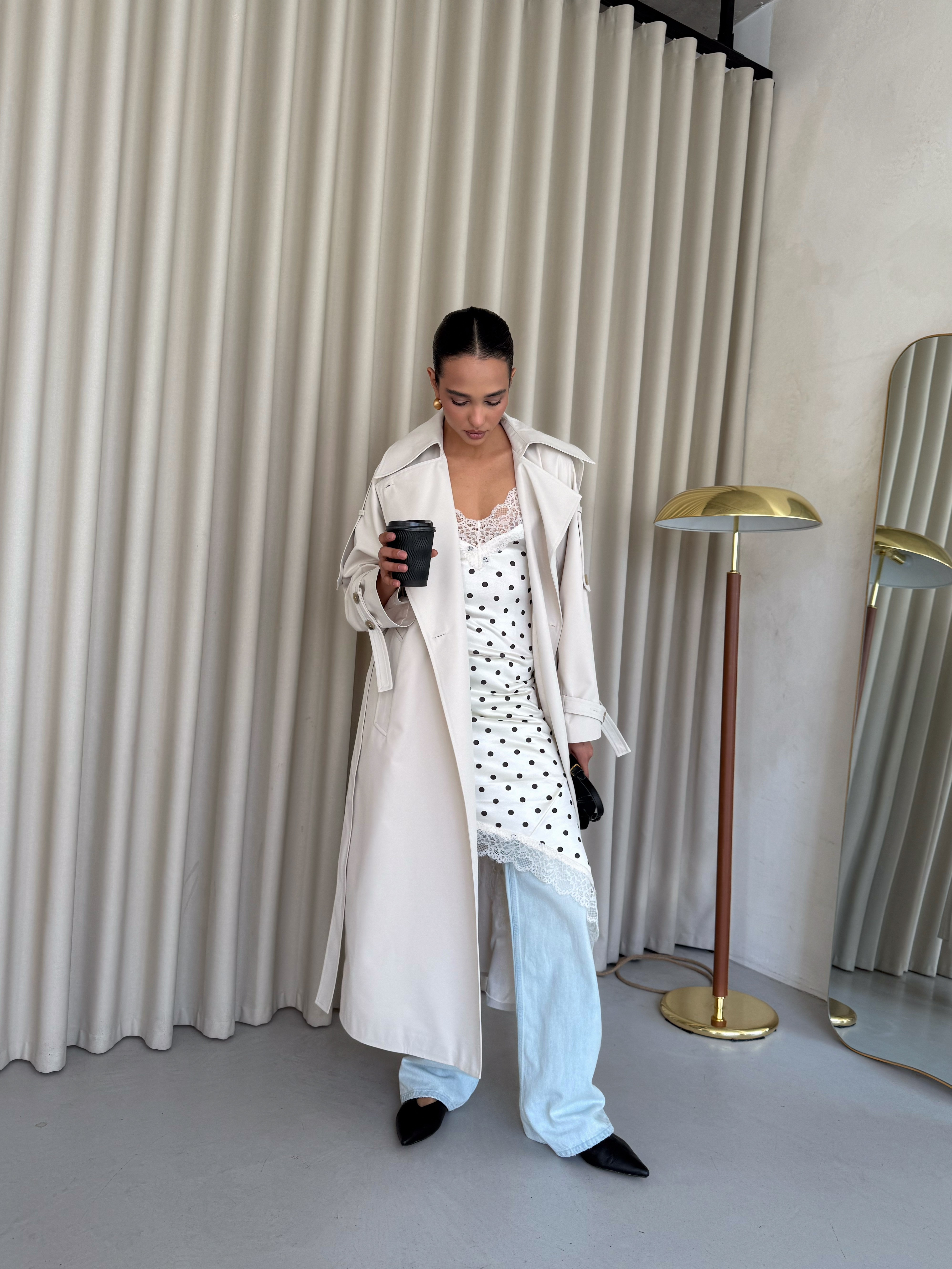Klasyczny trencz damski wykonany z wysokiej jakości, grubej 100% bawełny. Ponadczasowy fason z wiązaniem w talii podkreśla sylwetkę i sprawia, że płaszcz pasuje zarówno do codziennych, jak i eleganckich stylizacji.