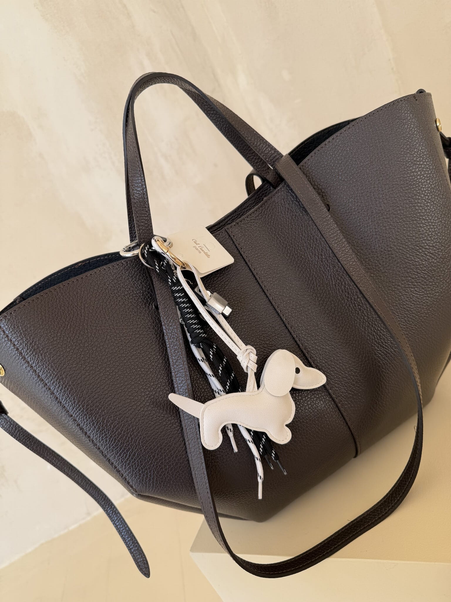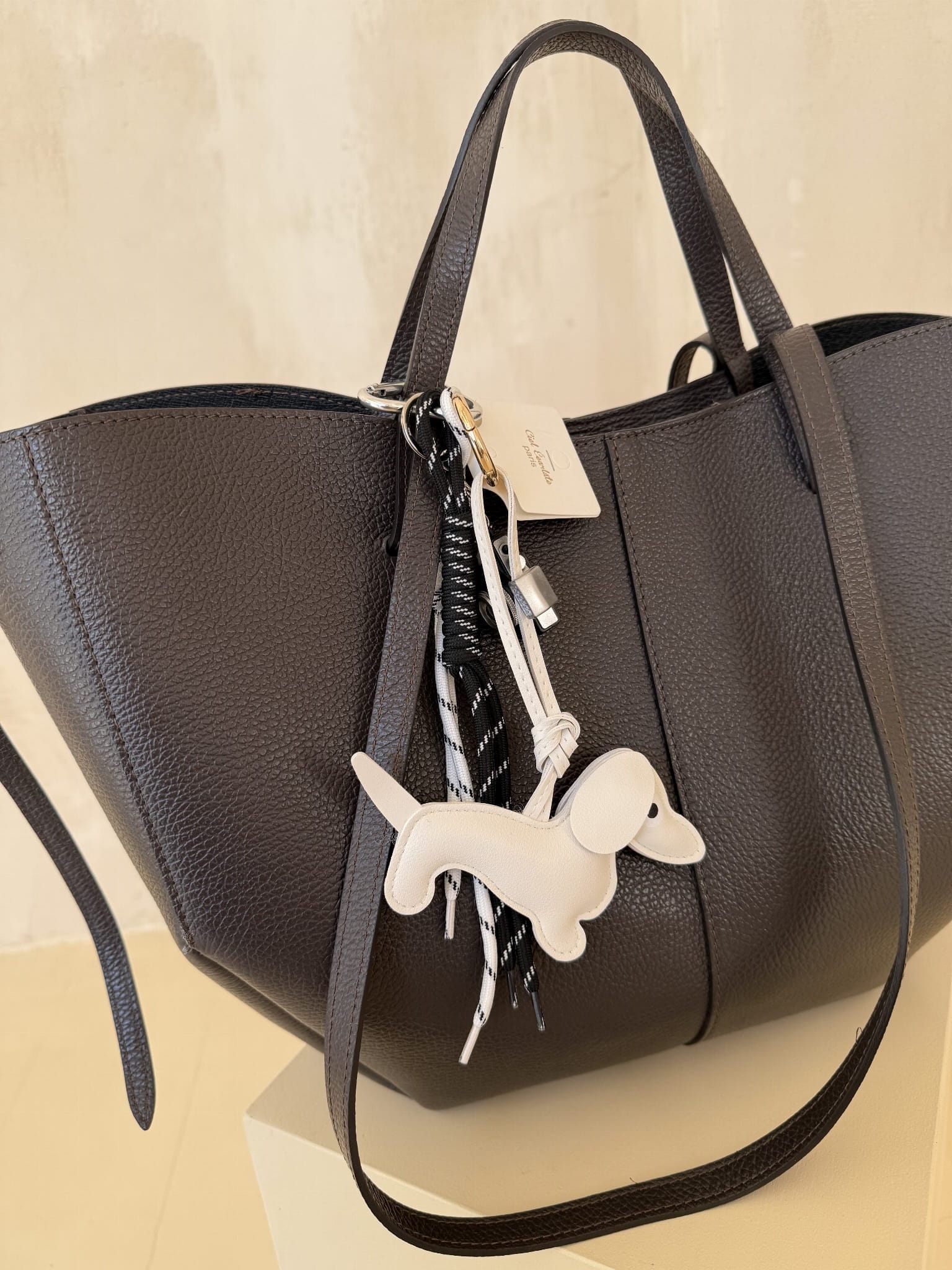 Dodaj charakteru swojej ulubionej torebce dzięki wyjątkowemu zestawowi zawieszek! Ten uroczy komplet składa się z minimalistycznej zawieszki w kształcie białego pieska (jamnika), eleganckich sznurków w kontrastowej kolorystyce oraz metalowych detali, które razem tworzą niebanalny i stylowy akcent.